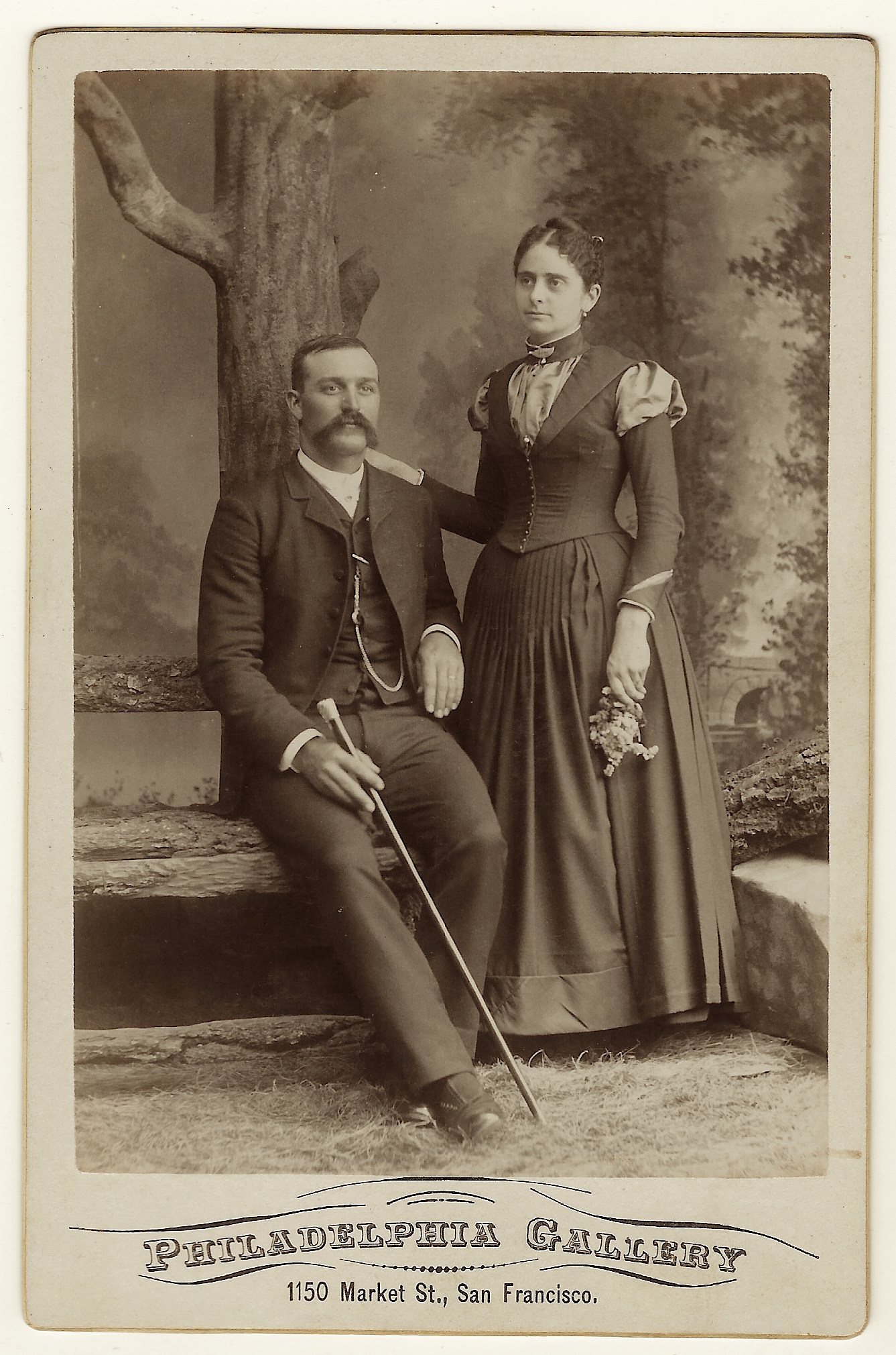 Being in San Francisco in the 1880’s or 1890’s was a prime time for exciting and interesting experiences. Mr and Mrs Springgat were in San Francisco during this era and decided to document their presence by having their portrait taken at the Elite Gallery. The reverse of this cabinet card reveals that the studio was operated by Mr. Jones and Mr. Lotz. To view another photograph by this pair’s gallery, click on the category “Photographer: Jones & Lotz”. The reverse of the cabinet card also informs us of the identity of the couple seen in this image. Preliminary research failed to find information about this couple.