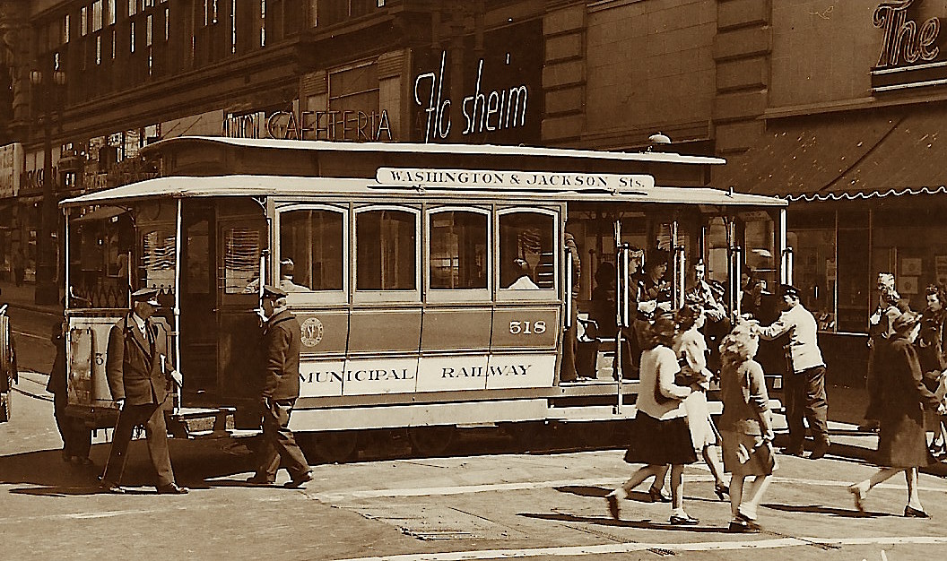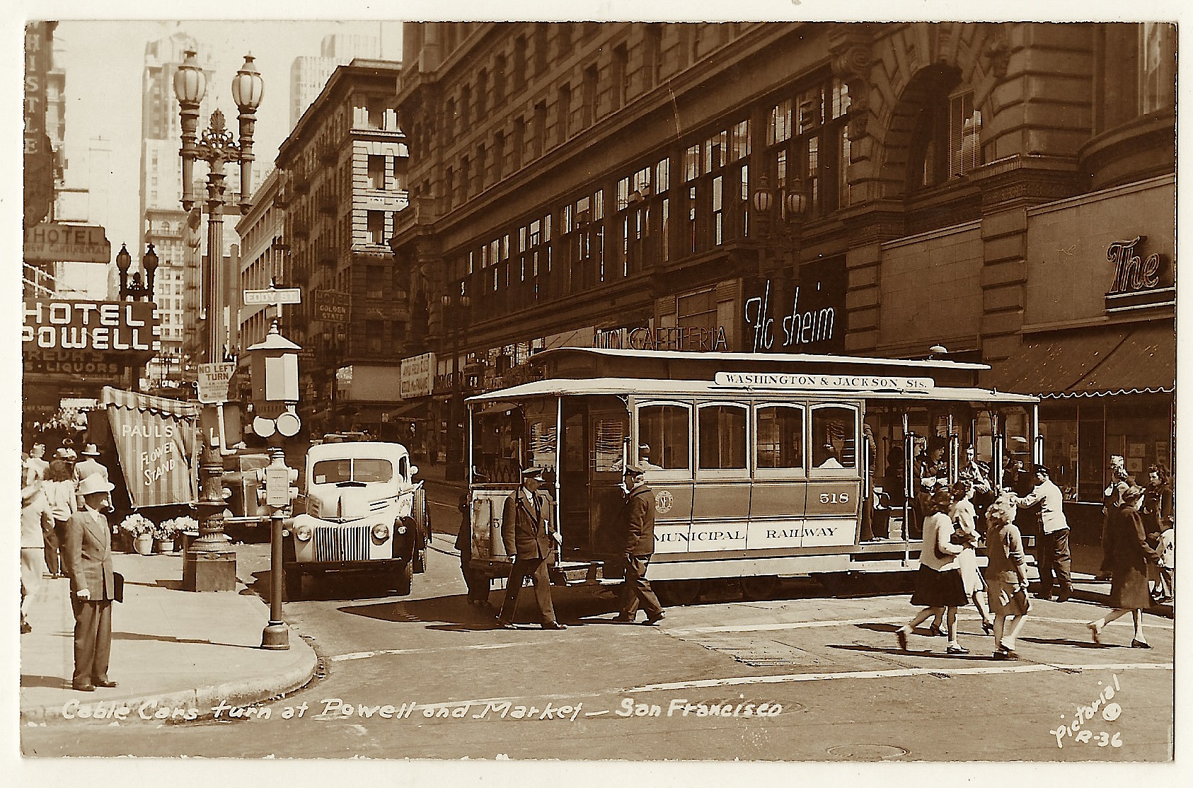 PHOTO OF A TROLLEY TURNING AROUND AT POWELL AND MARKET STREETS IN SAN FRANCISCO, CALIFORNIA