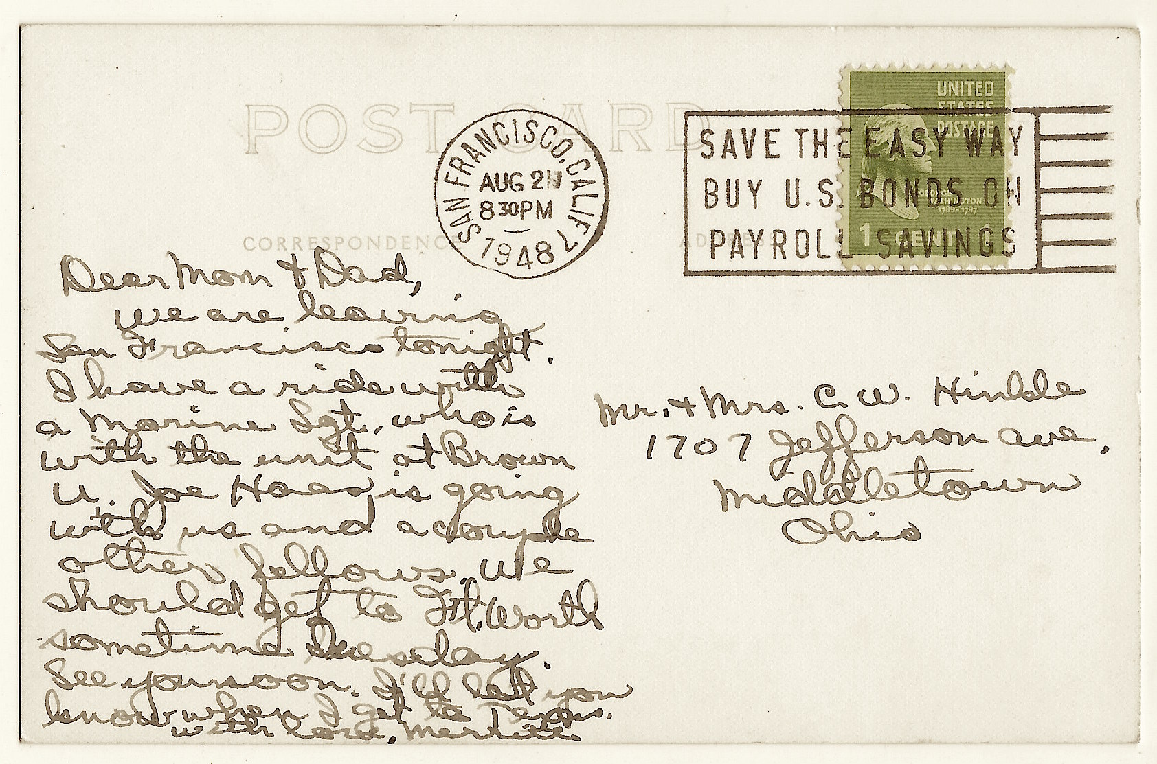 This vintage real photo postcard captures the “turning around” of a cable car in San Francisco, California. A caption on the front of the card discloses that the trolley is turning around at Powell and Market streets. Three conductors are doing the turning. Interestingly, the street sign in the photo is for Eddy Street. A sign on the trolley announces that the cable car is part of the Washington & Jackson Streets line. The car itself is numbered 518. Signage in the photograph advertises Florsheim Shoes, Paul’s Flower Stand, Hotel Powell, a cafeteria, and a liquor store. An article in the San Francisco Chronicle (1915) reveals that the flower stand still exists and has celebrated it’s 100th birthday. The stand was started because the founder of the next-door bank (Bank America) wanted a fresh flower in his lapel every day. In regard to the Powell Hotel; it was opened as the Hotel Turpin in 1908 and sold in 2014. The was redone and renamed. It is currently named the “Axiom Hotel”. The reverse of this postcard is illuminating. The card was postmarked in 1948. The sender of the card had written a message to his parents in Middletown, Ohio. The sender is a soldier and will soon leave for Fort Worth, Texas with a Marine Sergeant and three other men. The postcard is clearly meant to be a way of keeping in touch and calming any worry experienced by his parents. This real photo postcard is in excellent condition (see scans).