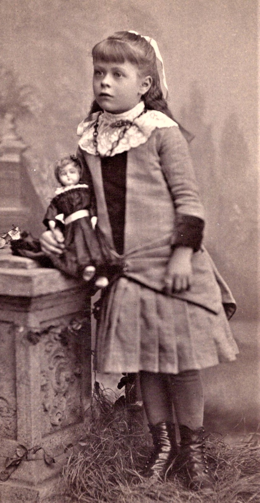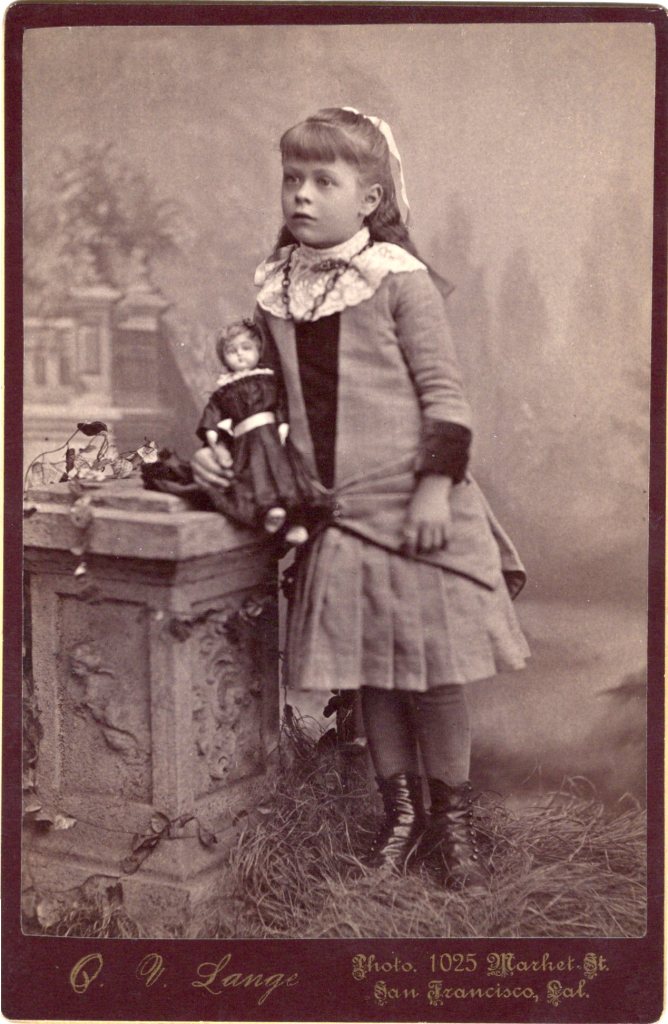 This cabinet card features a pretty young girl posing for her portrait while she holds her doll. The girl has a serious expression as she looks into the distance. She is wearing a necklace and has a bow in her hair. The photographer is Oscar Victor Lange (1853-1913) of San Francisco, California. He was a leading photographer in San Francisco and also was known as a landscape painter. He was born in Hoboken New Jersey to German immigrants. His family name was “Fahrenberg”. His father was a portrait painter and his family moved around alot. The 1860’s found them in New Orleans and in the 1870’s the family lived in Texas. During the 1870’s Oscar moved to San Francisco where he worked with Ernest W. Newth producing stereographs. At this time he changed his last name to “Lange”. In the 1880’s Oscar opened his own San Francisco studio on Market Street and during the 1890’s he relocated to Montgomery Street. Lange was known for his urban architectural photographs and also for his portraits of railroad workers. He is also noted for his astronomical photographs taken with the University of California. Lange died in 1913 from tuberculosis. This cabinet card has some extra features. Note the maroon mount and the gold trimmed edges. (SOLD)