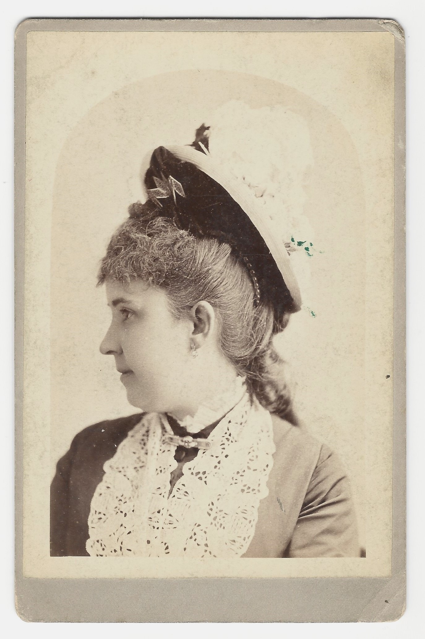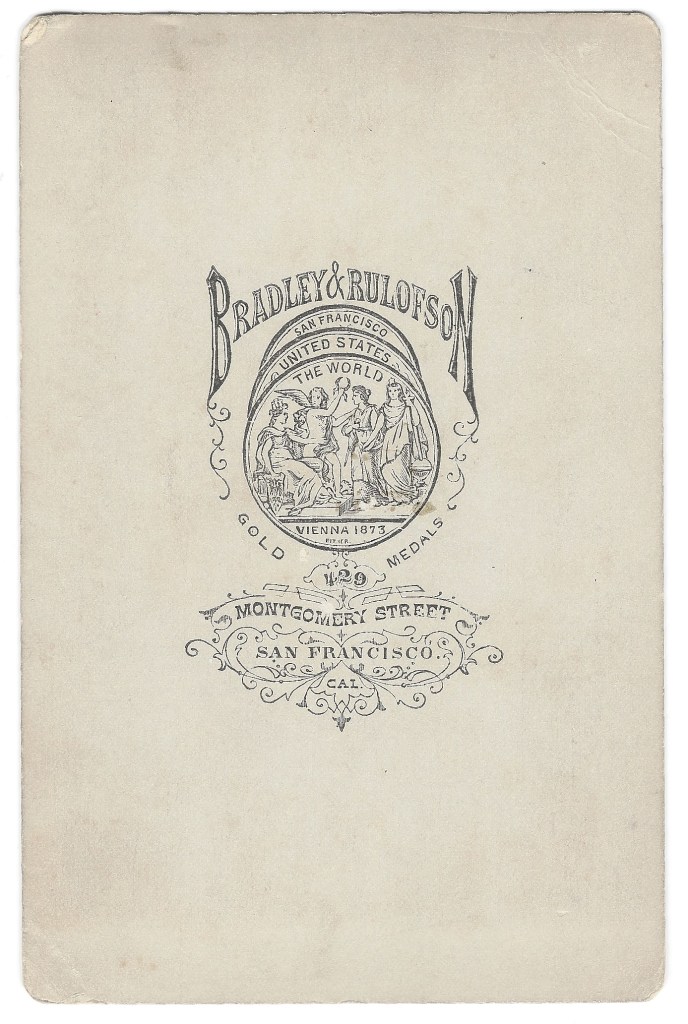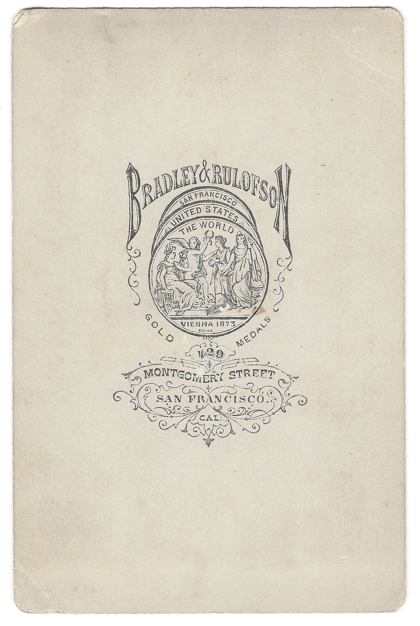 Cabinet Card 2 has an inscription on the reverse signed by “Etta”. Are these two cabinet cards, taken by the same photographer, portraits of the same woman? One can see enough resemblance between the two images to hypothesize that they are likely the same “Etta”. Take a look at another cabinet card by these photographers by clicking on the category “Photographer: Bradley & Rulofson”. That very same click will provide the reader with additional information about the photographers of this image. (SOLD)
