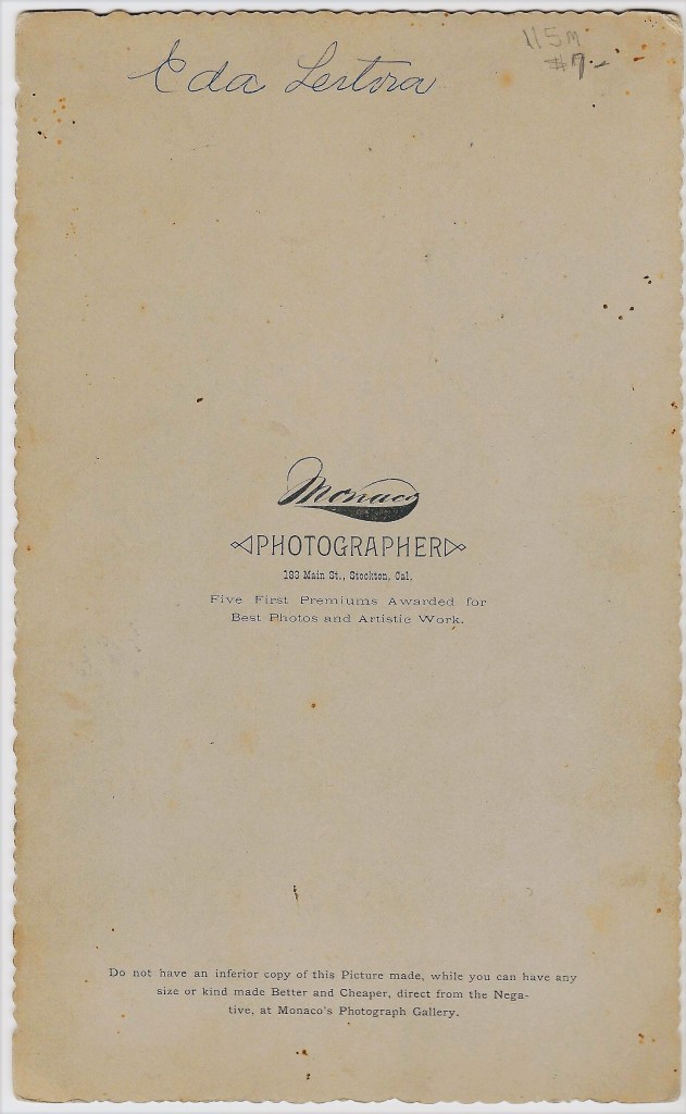 This vintage photograph is a Boudoir Cabinet Card. Boudoir Cabinet Cards are larger than the typical cabinet card. This photograph features a portrait of fashionable girl who appears to be in her teenage years. The identity of the girl is written on the reverse of the photograph. Her name appears to be “Eda Lestora”. What makes this photograph special is the photographer who took the photo. The 5″ x 8.25″ image was photographed at Monaco’s Excelsior Art Gallery at 183 Main Street in Stockton, California. J.B. Monaco (1856-1938) was a noted photographer in San Francisco but had satellite studios. A collection of his photographs can be found at the San Francisco History Center at the San Francisco Public Library. In 1875 Monaco arrived in the United States as an immigrant from Switzerland. His name was originally Giovanni Battista. He joined his brother in Eureka, Nevada. Louis Monaco operated a photo studio there and J.B. joined him in the business, thus launching a career as a photographer that would span 62 years. In 1887 J. B. moved to San Francisco where he was soon joined by his brother who died in 1897. During J. B.’s career, he distinguished himself with his earthquake and fire photographs. These images have been described as dramatic and journalistic. He documented much of early Nevada and Northern California history. His portraiture work of prominent San Francisco individuals and their families is considered to be exceptional. During his career, Monaco was described as the “Dean of North Beach photographers”. SOLD
