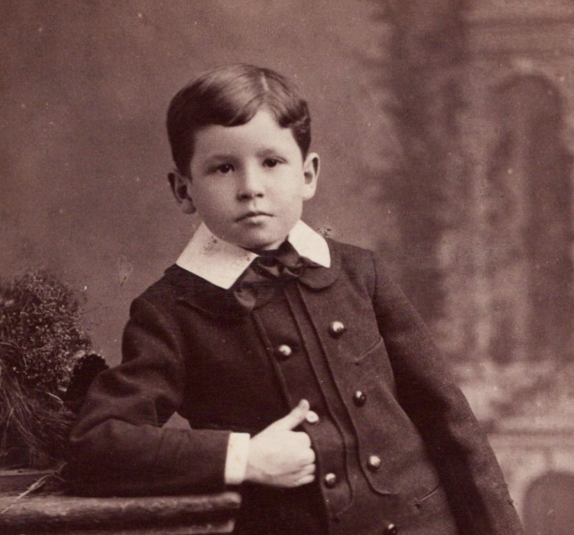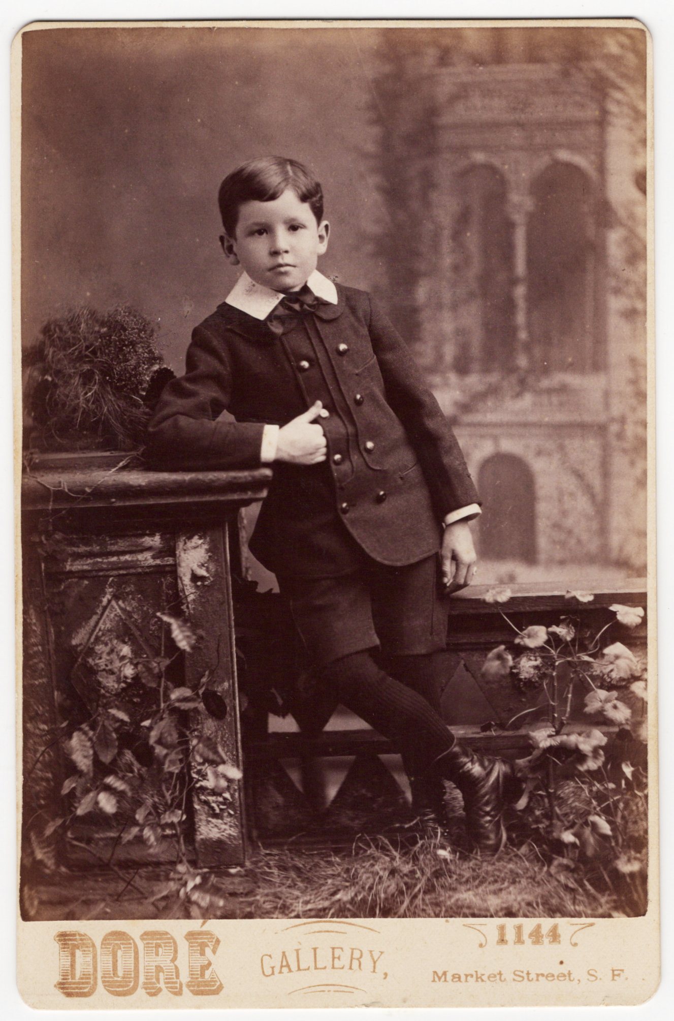 This handsome 1890s cabinet card portrait captures a young boy dressed in a refined double-breasted suit with brass buttons, short trousers, and dark stockings. A large white collar and a ribbon-style bow tie accent his formal ensemble. His neatly parted hair and composed facial expression give him the appearance of a thoughtful, well-mannered child, likely from an affluent San Francisco family. He stands confidently with one hand tucked into his jacket in a pose that evokes dignity and early Victorian formality, leaning gently on a faux balustrade surrounded by foliage in an elaborately staged studio setting. This photograph was produced by Cobb’s Doré Gallery, located at 1144 Market Street, San Francisco, as indicated on both the front and reverse of the mount. The studio succeeded the earlier firm Edouart & Cobb, one of the better-known names in late 19th-century California photography. Doré Gallery was active in the 1880s and 1890s, during the heyday of elaborately posed cabinet portraits. The backdrop features what appears to be a painted garden scene with a Mediterranean-style colonnade, adding a romantic flair to the image. (SOLD)