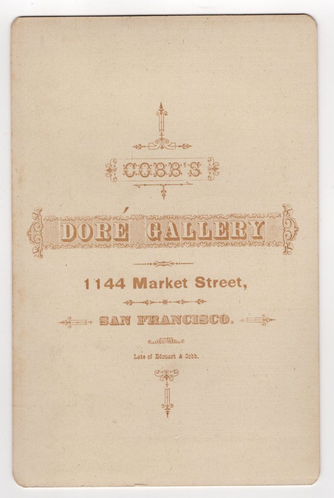 A beautifully dressed elegant lady poses for her portrait in San Francisco, California. She has long tight ringlet curls. A family of four could live under her tent-like dress. This cabinet card was produced by the studio of Edouart & Cobb. Edouart (1818-1892) was born in England and was the son of the famed silhouetist, Auguste Edouart. He was educated in England and between 1848 and 1850, he was a painter and daguerreotypist in New York City. He arrived in San Francisco in 1852 and worked as a landscape artist. By 1860, he opened a photographic studio where he was known for his watercolor photographs. In 1869 he joined David Cobb (1841-?) in a partnership in a photographic studio. The studio was located at 504 Kearny Street in San Francisco. Their partnership lasted until 1881. Cobb was active in San Francisco between 1863 and 1865, as well as between 1869 and 1889. In 1866 he worked in Grass Valley California. This is an early cabinet card. SOLD