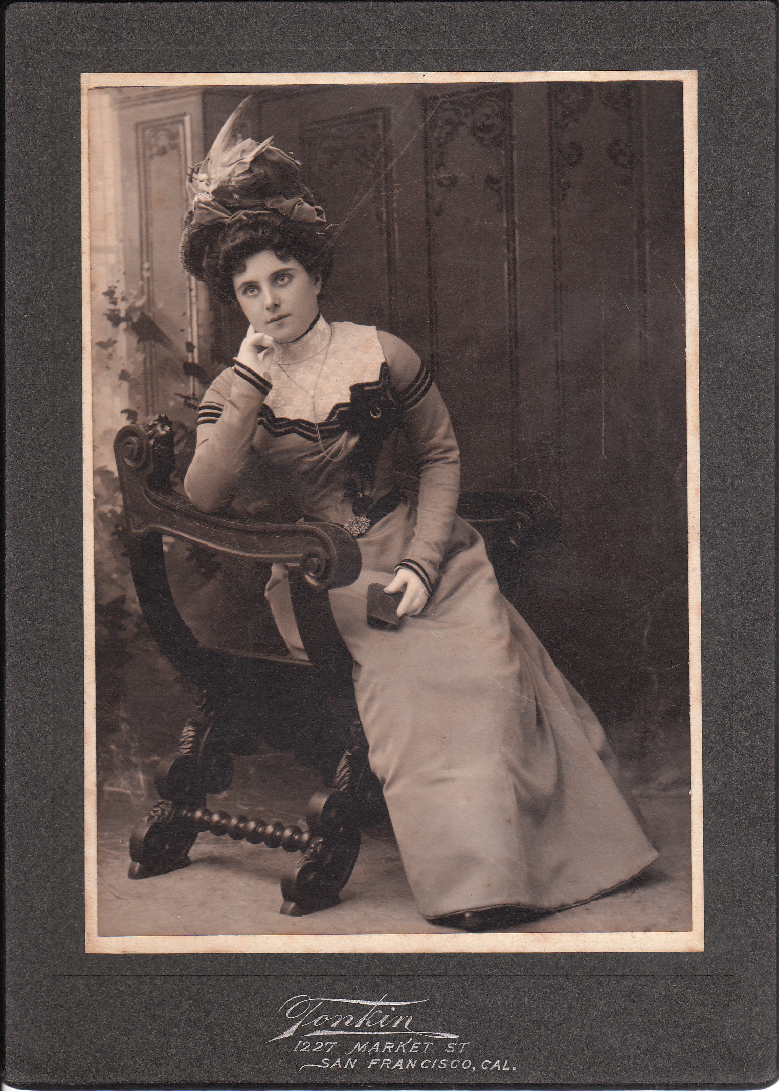 A beautifully dressed and pretty woman poses for her portrait at the Tonkin studio. She is wearing gloves and a most interesting hat and a long necklace. She is holding a small black object in her hand. Perhaps a visitor to this site can identify this object. My guess is that its some kind of small wallet. The 1900 US census finds a Herbert Tonkin (age 32) living in San Francisco with his wife Mary (age 30) and working as a photographer. Herbert Tonkin was an immigrant to the US and was born in Wales. To view other photographs by this photographer, click on the category “Photographer: Tonkin”.