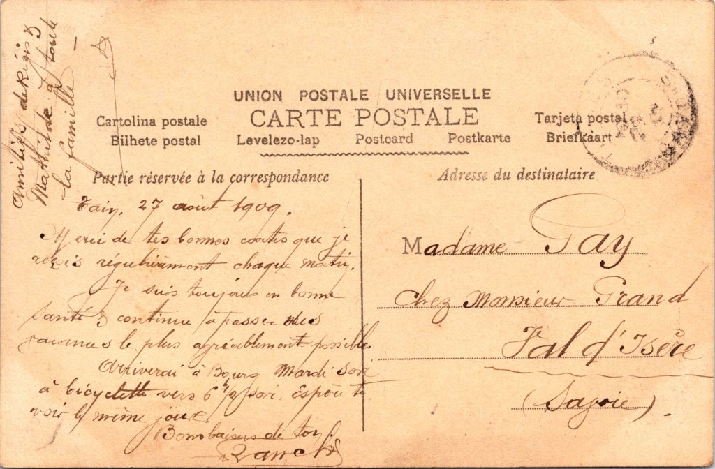 Postcard 2 features French theatre actress Gabrielle Rejane standing on the sideboard of her chauffeur driven limousine. A little boy (most likely her son) peaks over her shoulder at the camera. The car in this photograph is beautiful, as was Rejane. The image of Me. Rejane seen on this postcard was photographed by Paul Boyer (1861-1908) of Paris. He invented the use of magnesium for the flash in photography. He also was a very talented and award winning photographer. His studio was located at 35 Boulevard des Capucines in Paris. He produced many portraits of theater actors and actresses as well as other celebrities of his time. This postcard was published by Societe Industrielle de Photograpie (SIP) of Rueil, France and was part of a series (no. 2000).The postcard is addressed to Lyons, France and the writer of the message written on the card dated it 1908. This postcard is particularly special because it is a rare image of Gabrielle Rejane.