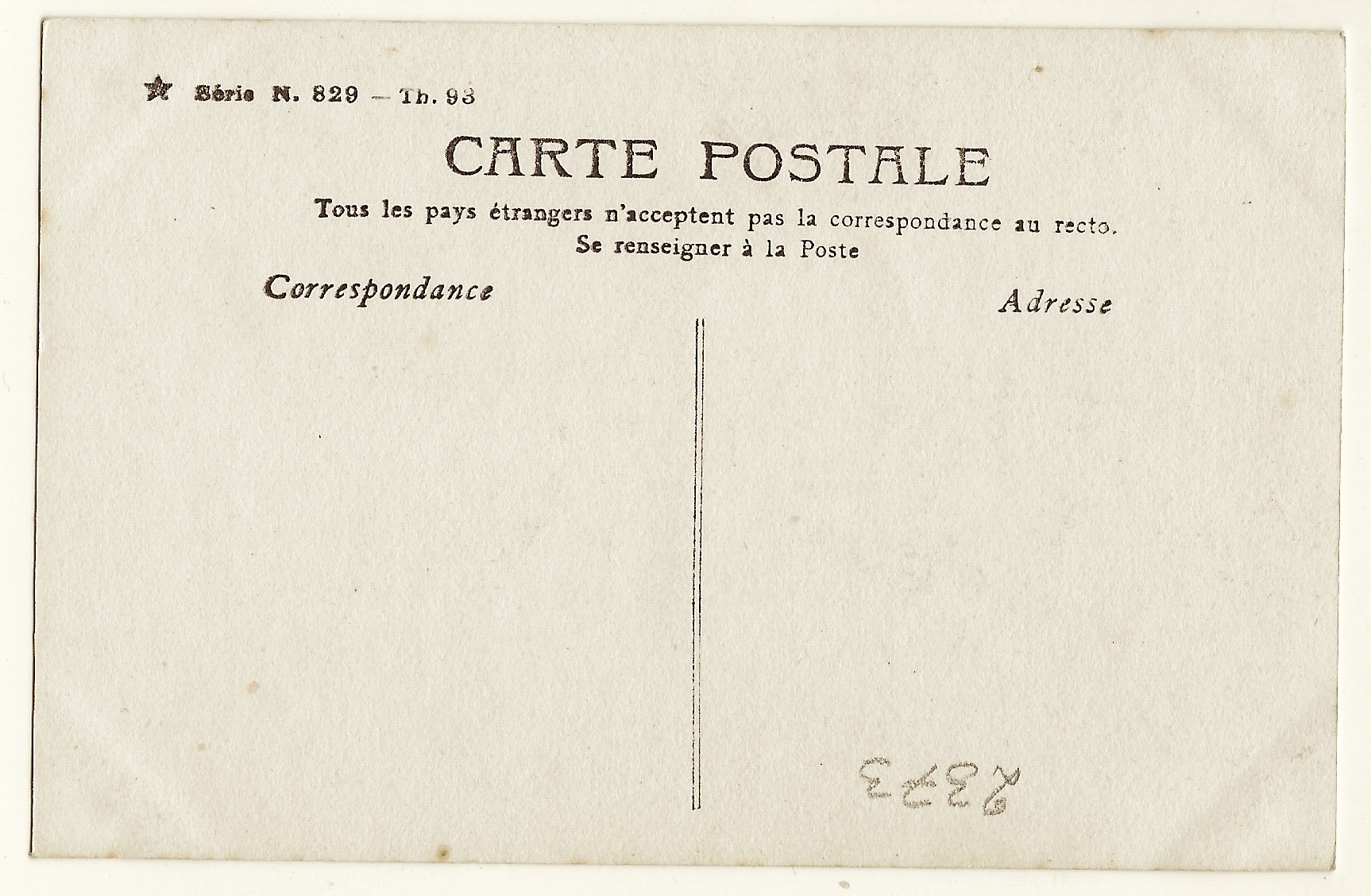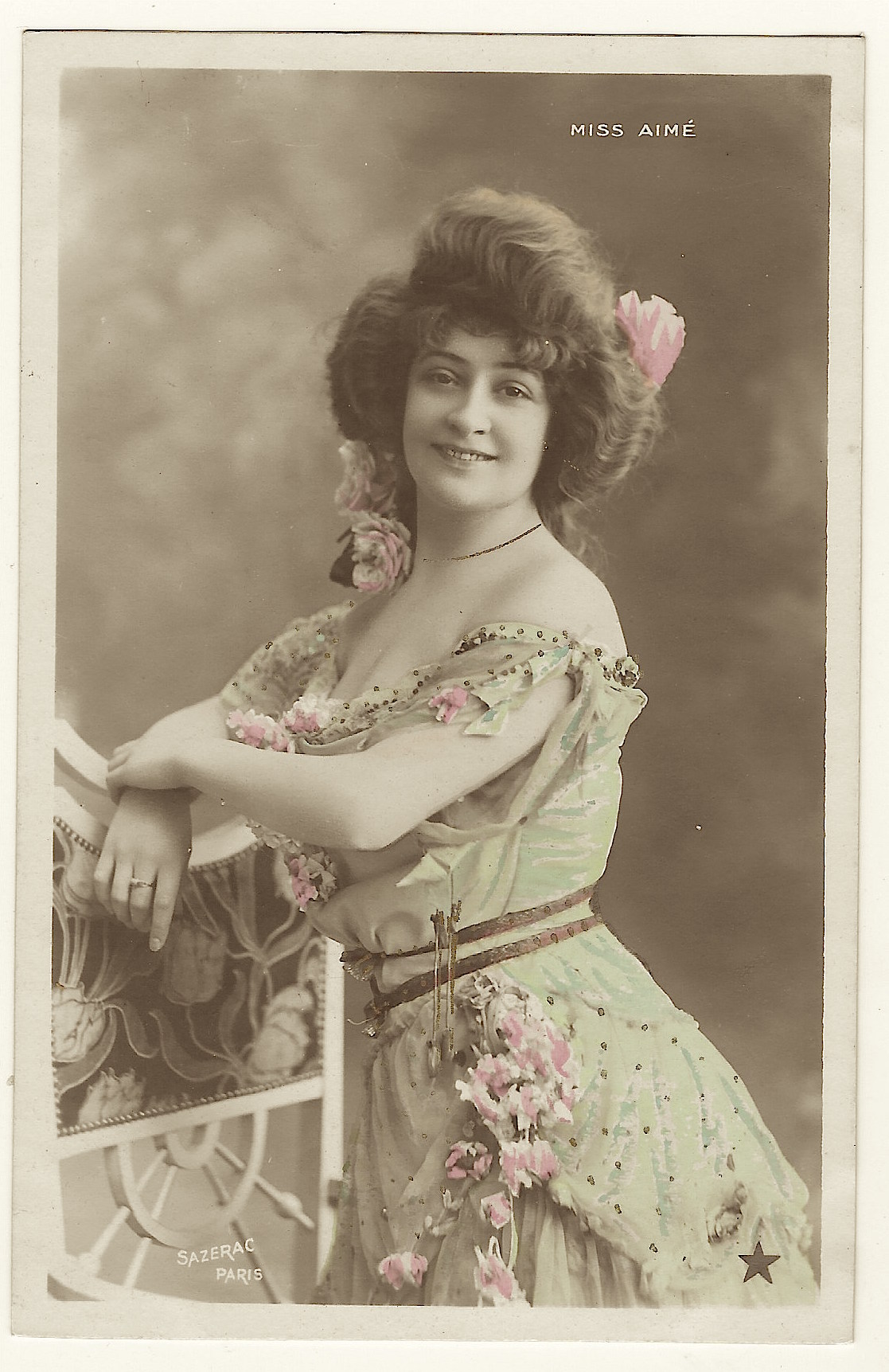 These vintage real photo postcards feature Miss Aime, a Paris cabaret performer. She is pretty and has a wonderful smile. Preliminary research found no biographical information concerning this actress. The photographer of Postcard 1 is the Sazerac studio which was located at the “Hotel Prive” in Paris, France. Little information could be located about Mr. Sazerac; but one can easily find real photo postcard portraits of French show girls that were produced by his studio. In fact Britain’s National Portrait Gallery has one of Sazarac’s photographs (circa 1906) in it’s collection. Postcard 1 is part of a series (N. 829 Th. 93) and is in very good condition (see scans). Postcard 2 offers another view of Miss Aime. She is wearing a different dress, but once again, she is bedecked with flowers. Like postcard 1, this photo was taken by Sazerac. The two postcards are part of the same series. This postcard is numbered (N. 829 Th. 93).