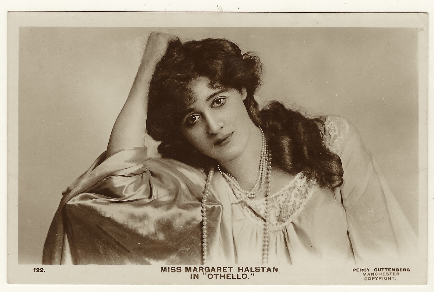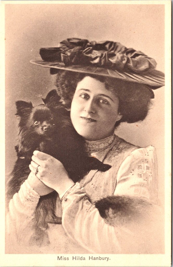 Photo 2 is a vintage real photo postcard featuring Hanbury holding her cute black dog over her shoulder. Note her flat hat. This postcard was published by Stewart & Woolf (London, England). SOLD