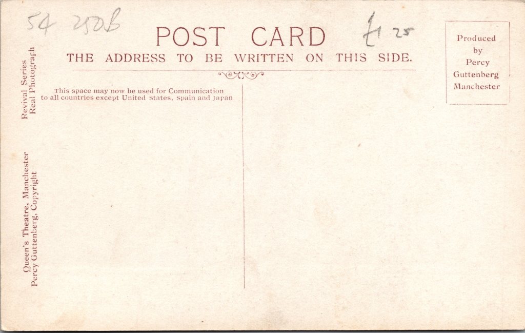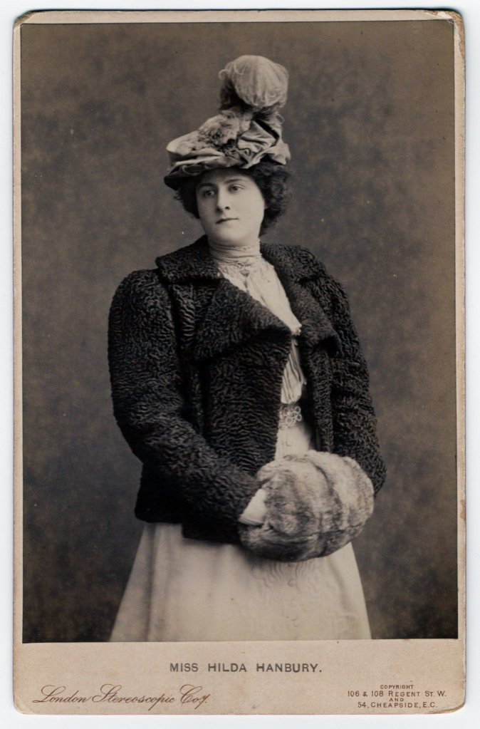 This cabinet card (Photo 1) features early British theatre actress, Hilda Hanbury (1875-1961). She is dressed for winter in this portrait. Note her warm looking coat and her hand-warming muff. Her hat is quite elaborate. Hilda’s sister, Lily Hanbury (1874-1908), was also an actress. Lily’s cabinet card photo portrait can be found elsewhere in the Cabinet Card Gallery. Hilda and Lily were cousins to actress Julia Neilson. Hilda began her acting career in the late 19th century and went on to have a successful stage and film career that spanned several decades. Hanbury made her professional stage debut in 1897 and went on to perform in a variety of plays throughout her career, including Shakespearean productions and contemporary dramas. She was particularly known for her performances in the plays of Noël Coward, and appeared in several of his works, including “The Vortex” and “Hay Fever.” Hanbury also appeared in a number of films during the 1930s and 1940s, including “The Ghoul” (1933) and “The Saint in London” (1939). Unlike her sister Lily, her film appearances were often in supportive roles. However, Hilda was considered a “stage beauty” and her image was popular on cabinet cards, cigarette cards, and postcards. Hanbury continued to act into her seventies, and her final stage appearance was in a production of Coward’s “Waiting in the Wings” in 1960. Hanbury was a close friend of playwright Noël Coward, and she appeared in several of his plays over the course of her career. Hanbury was known to be an avid bicyclist and a passionate gardener and was a member of the Royal Horticultural Society. She was a judge at flower shows and often exhibited at the Chelsea Flower Show. Hilda married Arthur William Fox (1870-1956) in 1905. After the marriage, she retired from the stage and lived in a sixteen-room house. The couple had nine servants. Hilda and her husband divorced in 1923. The divorce was precipitated by her husband’s adultery. The photograph seen on this cabinet card was taken by the London Stereoscopic Company, located in Cheapside, England. The photo was taken sometime in the 1880’s or 1890’s. Interestingly, there is warning notice on the reverse of the photograph concerning it’s copyright. In addition, there is an advertisement offering photography lessons, on the card’s reverse. There is also an advertisement from H. G. Pearce & Co., a stationer and printer. SOLD