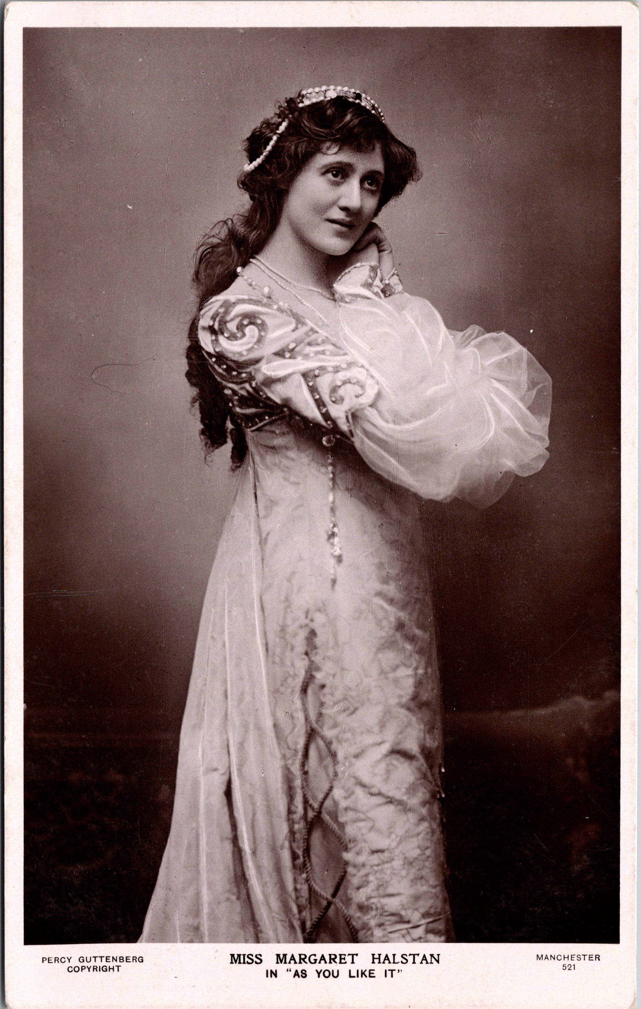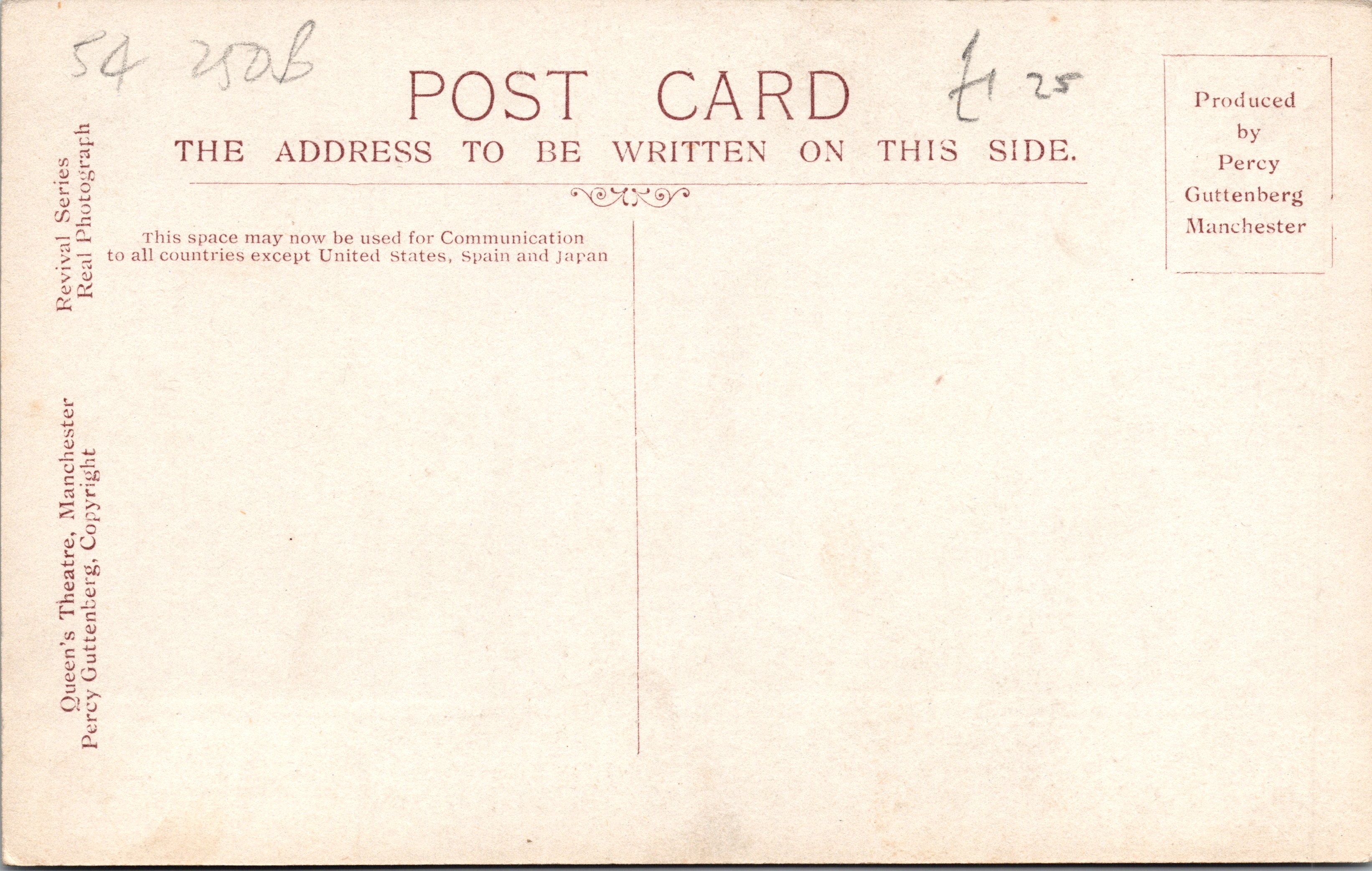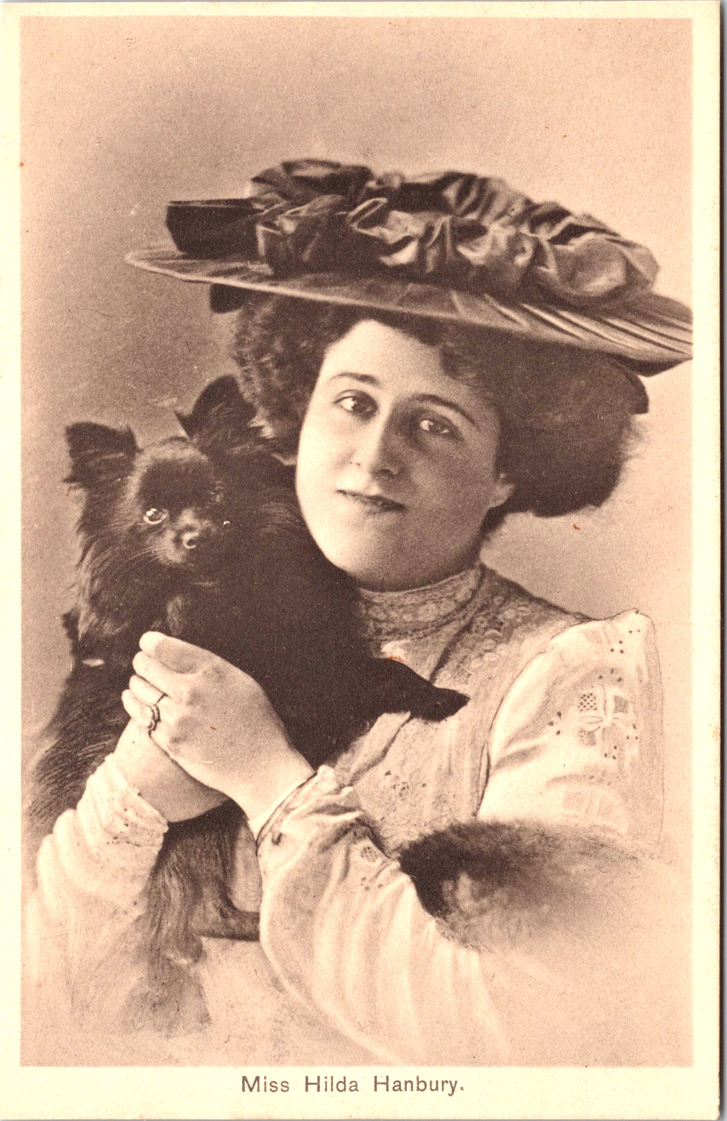 Photo 2 is a vintage real photo postcard featuring Hanbury holding her cute black dog over her shoulder. Note her flat hat. This postcard was published by Stewart & Woolf (London, England). SOLD
