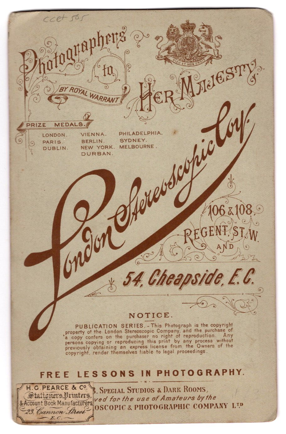 This cabinet card (Photo 1) features early British theatre actress, Hilda Hanbury (1875-1961). She is dressed for winter in this portrait. Note her warm looking coat and her hand-warming muff. Her hat is quite elaborate. Hilda’s sister, Lily Hanbury (1874-1908), was also an actress. Lily’s cabinet card photo portrait can be found elsewhere in the Cabinet Card Gallery. Hilda and Lily were cousins to actress Julia Neilson. Hilda began her acting career in the late 19th century and went on to have a successful stage and film career that spanned several decades. Hanbury made her professional stage debut in 1897 and went on to perform in a variety of plays throughout her career, including Shakespearean productions and contemporary dramas. She was particularly known for her performances in the plays of Noël Coward, and appeared in several of his works, including “The Vortex” and “Hay Fever.” Hanbury also appeared in a number of films during the 1930s and 1940s, including “The Ghoul” (1933) and “The Saint in London” (1939). Unlike her sister Lily, her film appearances were often in supportive roles. However, Hilda was considered a “stage beauty” and her image was popular on cabinet cards, cigarette cards, and postcards. Hanbury continued to act into her seventies, and her final stage appearance was in a production of Coward’s “Waiting in the Wings” in 1960. Hanbury was a close friend of playwright Noël Coward, and she appeared in several of his plays over the course of her career. Hanbury was known to be an avid bicyclist and a passionate gardener and was a member of the Royal Horticultural Society. She was a judge at flower shows and often exhibited at the Chelsea Flower Show. Hilda married Arthur William Fox (1870-1956) in 1905. After the marriage, she retired from the stage and lived in a sixteen-room house. The couple had nine servants. Hilda and her husband divorced in 1923. The divorce was precipitated by her husband’s adultery. The photograph seen on this cabinet card was taken by the London Stereoscopic Company, located in Cheapside, England. The photo was taken sometime in the 1880’s or 1890’s. Interestingly, there is warning notice on the reverse of the photograph concerning it’s copyright. In addition, there is an advertisement offering photography lessons, on the card’s reverse. There is also an advertisement from H. G. Pearce & Co., a stationer and printer. SOLD
