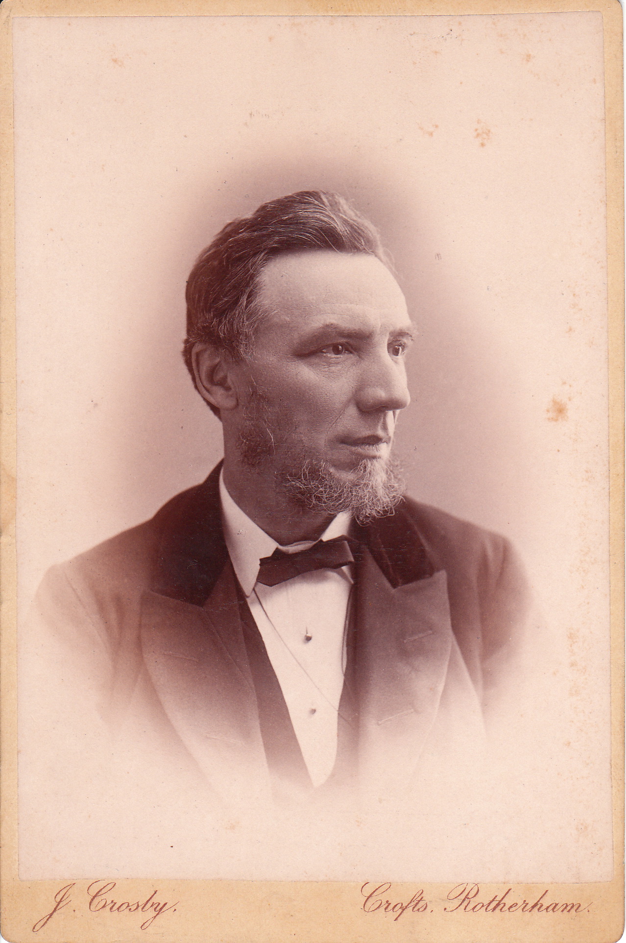 This Cabinet card is an image of Sir Charles Skelton. Research about this interesting man reveals that his name shows up in all sorts of places. He was a busy man with many interests. He died in 1913 after suffering a stroke. He was considered a modern puritan. He was very engaged in and financially supportive of the Methodist New Connexion Body in Sheffield, England. He was also very active in the big spending highway committee of the Sheffield City Council. He was a major proponent of the use of granite in highway and transportation construction. This was a controversial issue and a anti-granite association was formed to oppose him. In 1895, he became Mayor of Sheffield. In 1897, during a visit from Queen Victoria, Skelton was knighted. Sir Charles Skelton is cited in many varied publications. In 1897, he was mentioned by the British Medical Journal as active in advocating the study and eradication of Tuberculosis. In 1904, The Zoophilist and Animals Defender, reports that Skelton was an active advocate of the antivivisection organization. (Vivisection is conducting surgery on animals for simply experimental purposes). Skelton was a man before his time; if alive today he would be anti animal testing and a member of PETA. It is written that “he was one of the really big men of the City” who was known for his integrity, thoroughness, and “unswerving honesty of purpose”. The man was a non conformist; he opposed militarism (the boer war), and was a teetotaller and opposed liquor traffic. The photographer of this image is J. Crosby of Rotherham, England. Rotherham is a town in South Yorkshire. Rotherham and Sheffield are about four miles apart. The reverse of this card has an inscription stating “Uncle Sir Charles Skelton”. (SOLD)
