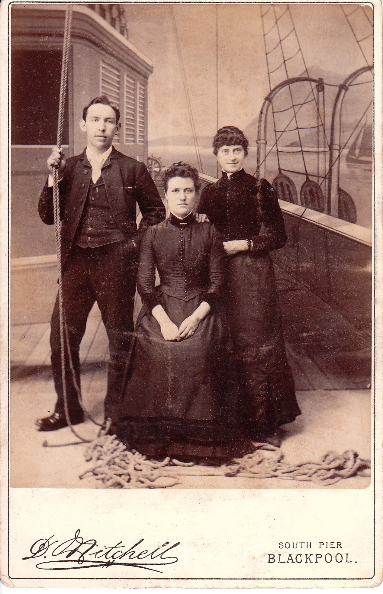 This cabinet card of a man and two women posing aboard a ship, was photographed by D. Mitchell of Blackpool, Great Britain. The photographer, whose studio was located near a pier in the seaside city of Blackpool, utilized a relevant nautical theme. The backdrop is fantastic and the hanging rope held by the gentleman, and the ropes in front of the ladies, are a “great touch”. This is one of the finest uses of background scenery and props that can be found in the entire cabinet card gallery. The South Pier was originally named the Victoria Pier. The pier opened in 1893 and served vacation travelers to Blackpool. The subjects of this cabinet card image are likely tourists on holiday.