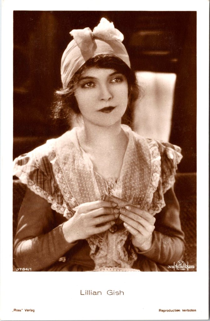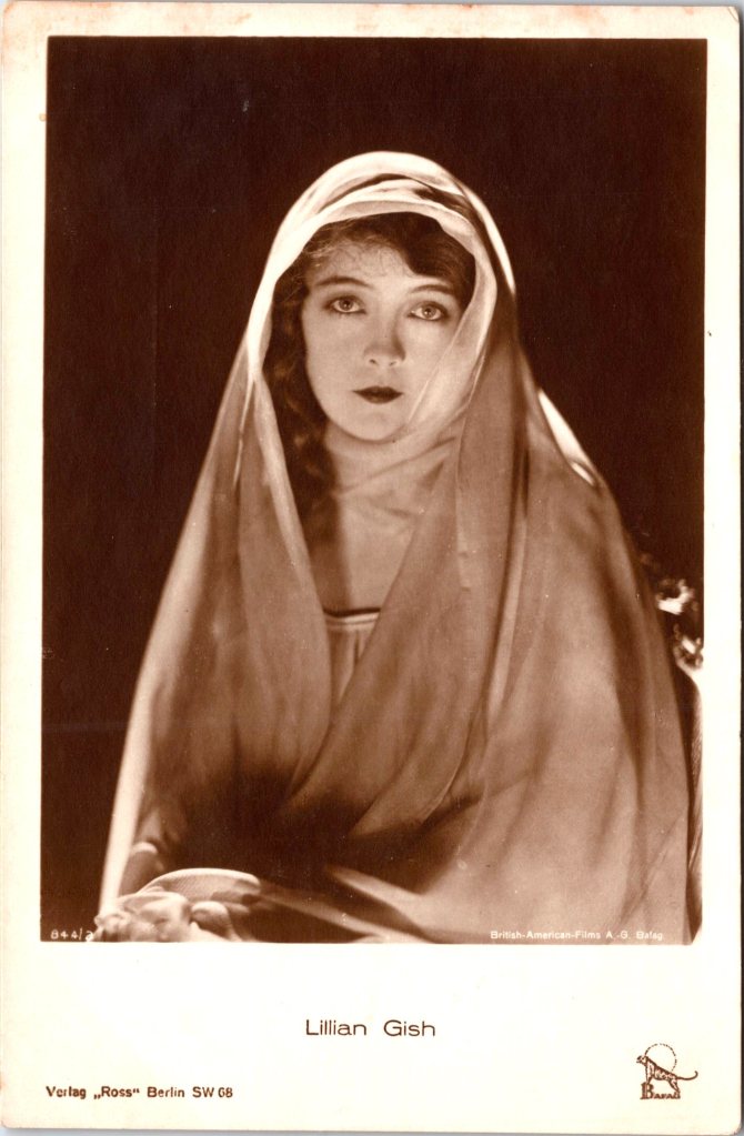 Postcard 2 : This postcard portrait was taken in 1923. LIllian was 30 years old and the photo shows her as she appeared in the film “The White Sister”. This 1923 silent drama film co-starred Ronald Coleman. The logo for British American Films can be seen in the lower right corner of the image. This postcard was published by Ross Verlag (Berlin), is (844/2) in a series. SOLD