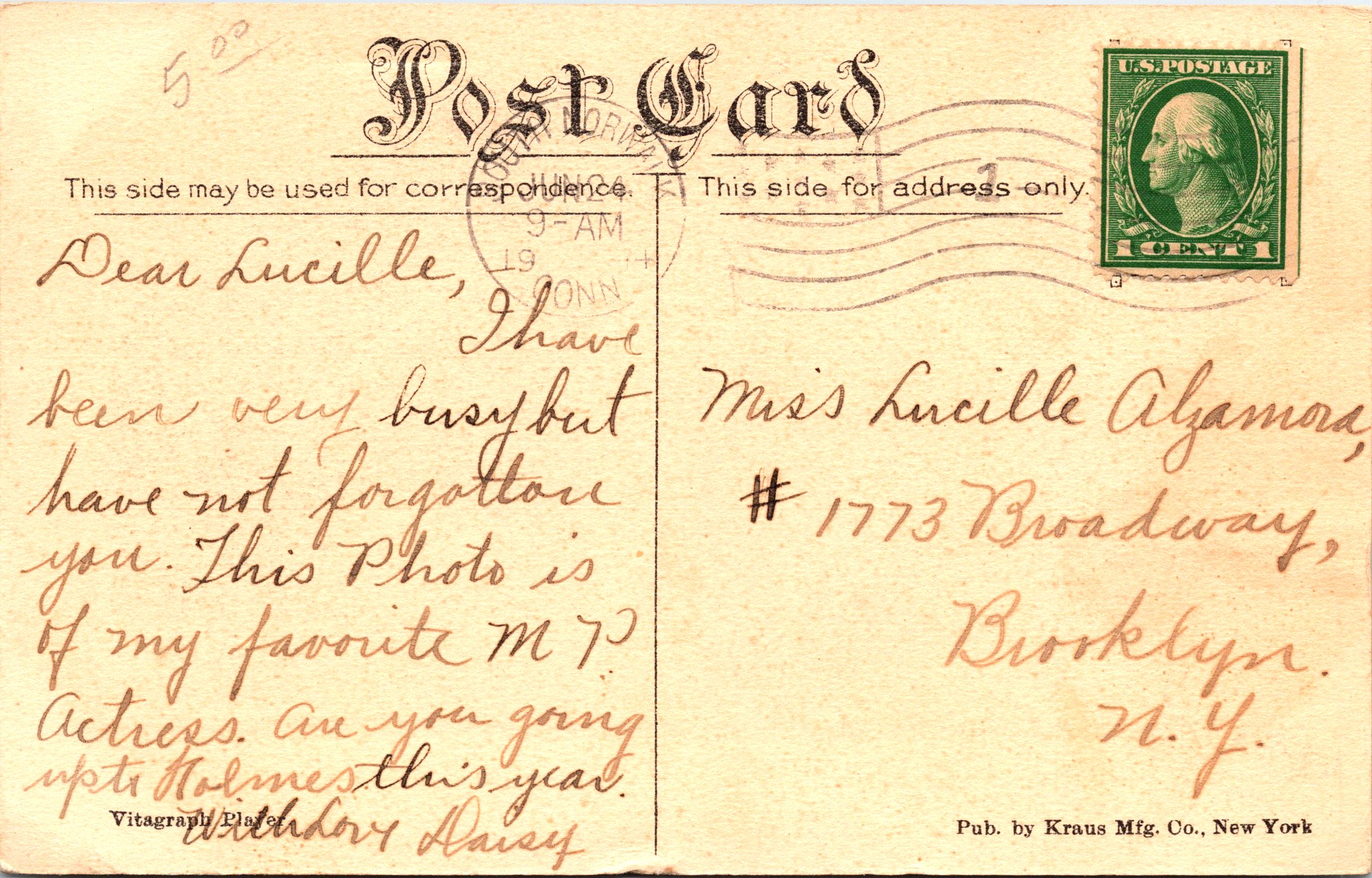 Postcard 1 features American actress, Lillian Gish (1893–1993). She is considered one of the pioneering figures in early cinema. Born in Springfield, Ohio, Gish began her career on the stage alongside her sister, Dorothy, but soon transitioned to film, where her delicate features and expressive acting made her a favorite of directors during the silent film era. In 1912, Gish joined legendary director D.W. Griffith, becoming his protégé and collaborating with him on groundbreaking films like The Birth of a Nation (1915), Broken Blossoms (1919), and Way Down East (1920). These films cemented her reputation as a leading lady, often playing roles that emphasized innocence and emotional depth. She was known for her meticulous attention to the art of acting. She helped establish the art of screen acting, emphasizing subtlety and naturalism at a time when film was still evolving away from theatrical exaggeration. She was a versatile actress, adapting well to various roles, from delicate heroines to more complex characters, and her commitment to authenticity often saw her enduring extreme conditions on set, like filming in freezing temperatures and performing her own stunts. When silent films gave way to “talkies” in the late 1920s, Gish transitioned gracefully, though her popularity declined as she aged and Hollywood’s focus shifted to younger stars. Still, she continued acting, taking on character roles and even appearing on television. One of her most memorable later performances was in The Night of the Hunter (1955), a film now regarded as a classic. In addition to her acting career, Gish became a vocal advocate for film preservation and the legacy of silent cinema. She gave lectures on the subject. Her work won her numerous accolades, including an honorary Academy Award in 1971, and she remained active in the industry well into her later years. Gish’s career spanned over 75 years, and she is remembered as an icon who bridged the silent and sound eras, leaving an indelible impact on American cinema. Lillian Gish, though a public figure, led a private and often solitary personal life. She was born on October 14, 1893, in Springfield, Ohio, to James Leigh Gish and Mary Robinson McConnell. Her early life was marked by hardship; her father abandoned the family when she was young, leaving her mother to support Lillian and her younger sister, Dorothy. Her mother opened a candy store in New York City, where the family eventually settled, and the two sisters began acting in theater to help support the family financially. Lillian and Dorothy were close throughout their lives, frequently working together in theater and film. Lillian took on the role of family protector and provider from a young age. Though she later became one of the most celebrated actresses of her time, Lillian remained deeply committed to her family, often prioritizing family relationships over romantic entanglements. She never married and had no children, believing that marriage and family life might interfere with her career. However, she did have close friendships with several prominent figures in Hollywood, including her frequent collaborator, director D.W. Griffith, with whom she shared a professional and deeply loyal relationship. There were rumors of a romance with Griffith, though Gish maintained that their relationship was strictly professional. Other rumored suitors included producer Charles Duell and critic George Jean Nathan, yet she largely avoided the spotlight when it came to romance. She valued independence and often expressed a desire to avoid the constraints she felt marriage could impose on her creative pursuits. In later life, she lived with her sister Dorothy until Dorothy’s death in 1968, a loss that deeply affected her. In her final years, Gish continued to work in the entertainment industry and to honor the legacy of silent cinema. She died in 1993, at the age of 99, leaving behind a remarkable career and a life dedicated to her art, family, and the preservation of film history.