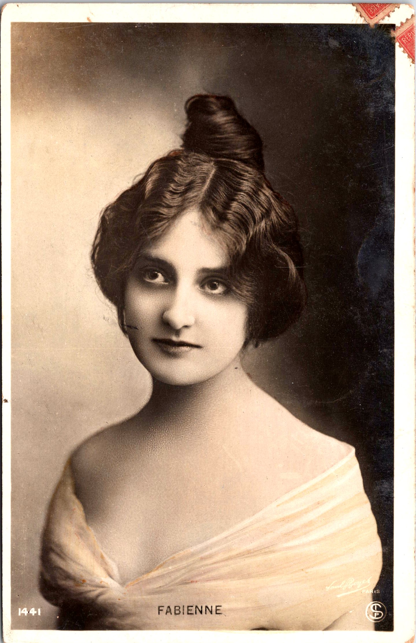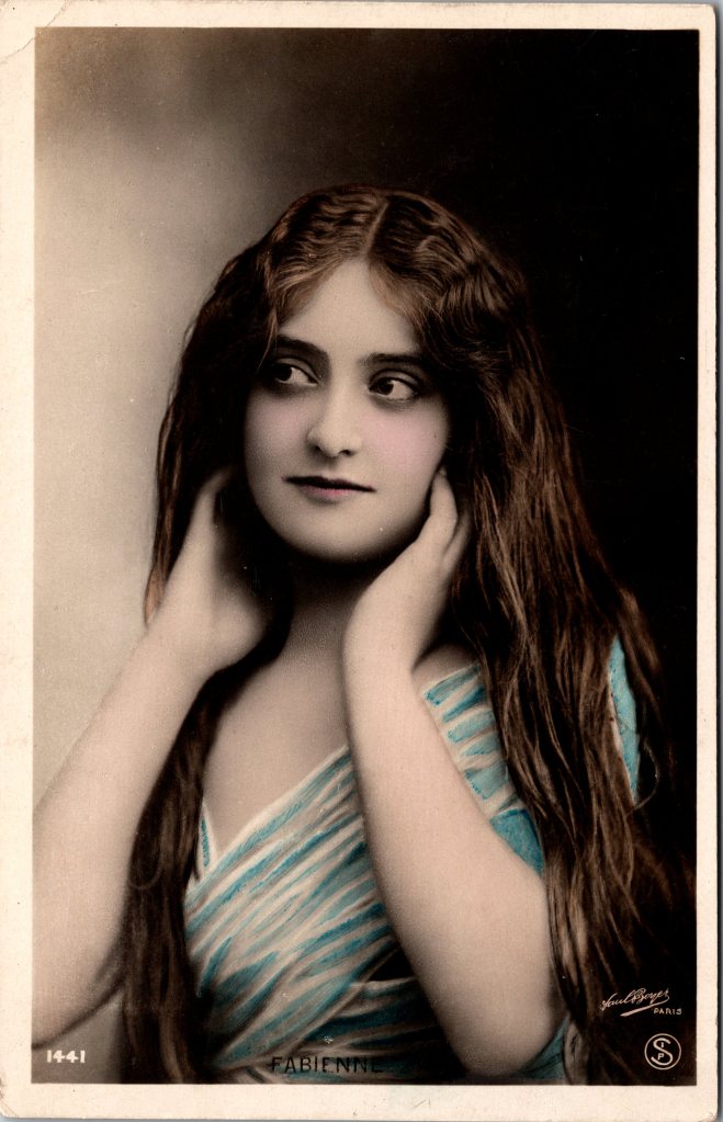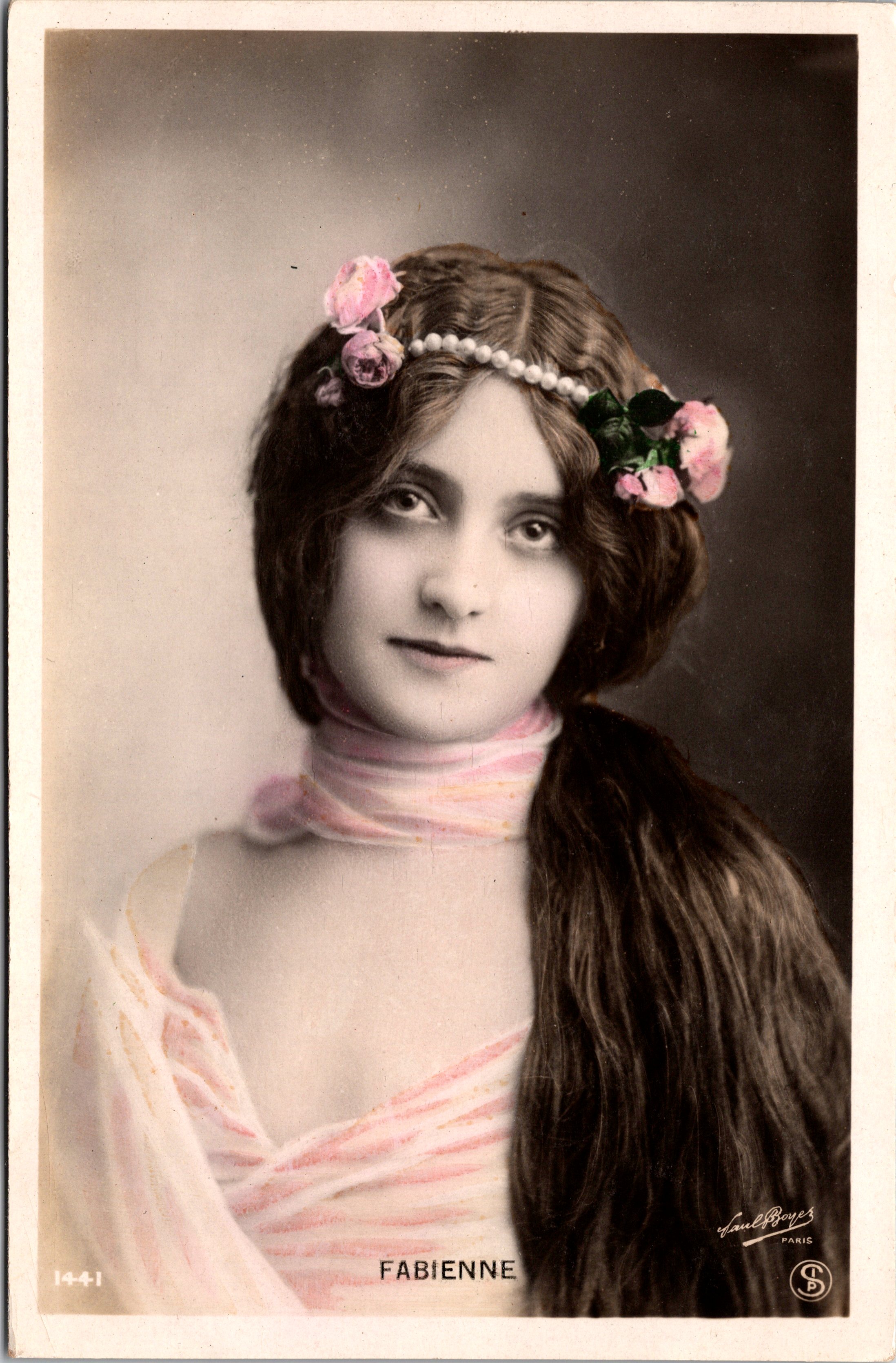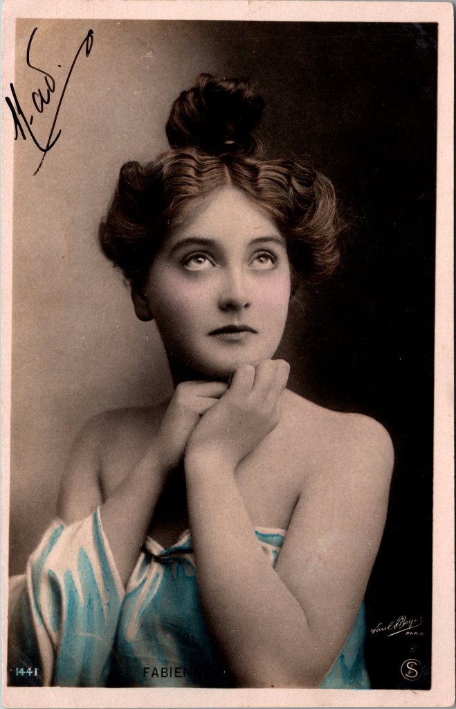 Postcard 1 features lovely edwardian stage performer, Fabienne Darlay. Her photograph was expertly taken by the celebrated French photographer, Paul Boyer (1861-1908). He was based in Paris, and photographed many celebrities during his career. This postcard was published by Societe Industrielle de Photograpie (SIP) of Rueil, France, and was part of a series (no.1441). The image was hand tinted. This postcard dates back to circa 1904-1908. Note there is minor cornerwear and a light crease in the upper left hand corner of the card. (SOLD)