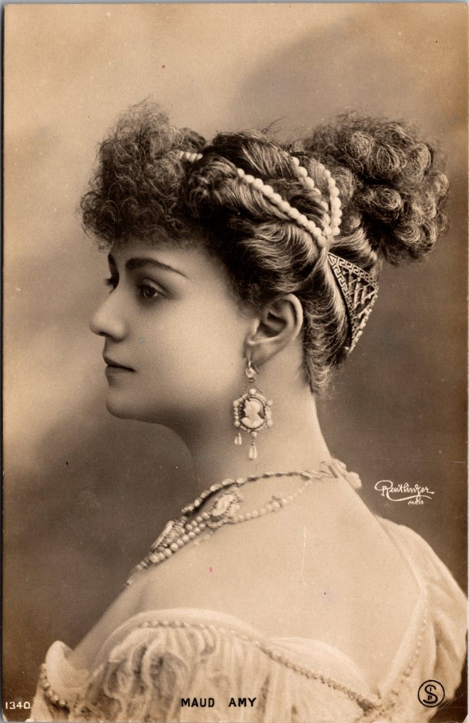 This vintage real photo postcard features a beautiful French actress named Maud Amy. Her name appears in theater magazines around the year 1904. Miss Amy is adorned with a number of necklaces and hair pieces as well as Cameo earrings. The photo seen on this postcard, was taken by Leopold Reutlinger. He was a famous celebrity photographer of his era. He operated a studio in Paris, France. This postcard was published by SIP as part of a series (no 1340). (SOLD)