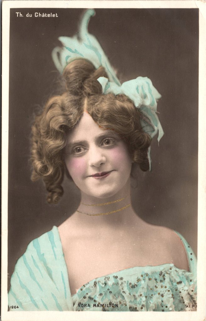 This uncommon vintage real photo postcard features Nora Hamilton. She was a stage performer. Very little biographical information about Miss Hamilton could be found during my preliminary research. There was an actress by the same name who acted on Broadway during the era that this postcard was published. Nora Hamilton appeared in two plays; “The Merry Widow and the Devil” (1908) and “Miss Jack” (1911). The caption in the top left hand corner of the image provides the name of a French theatre named Theatre du Chatelet. Hamilton performed there. The theatre was built on the site of a small castle in about 1861. It was located in Paris, France. This postcard is color tinted. The card was published by S.I.P. and was part of a series (No.1264). This portrait postcard is in very good condition (see scans).