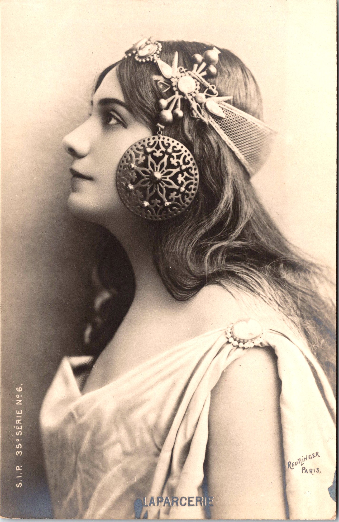 This vintage real photo postcard features a beautiful French actress, theater director, and poet, named Cora Laparcerie (1875-1951). Laparcerie looks quite beautiful, and goddess like, in this profile postcard portrait. Note her ornamental hair band. She played various theatrical productions, including classical plays and original French drams. Laparcerie began her career at the Odeon theater in Paris. Soon she was taking on major roles in French theaters. She was married to Jacques Richepin, the son of poet, Jean Richepin. The pair were a notable couple in French artistic circles. Laparcerie managed several prestigious Parisian theatres. In her later career she concentrated on writing poetry, theater columns and early radio dramas. This postcard was published by SIP and Laparcerie’s photograph was taken by Leopold Reutlinger. This is an undivided back postcard (at least pre 1907). SOLD