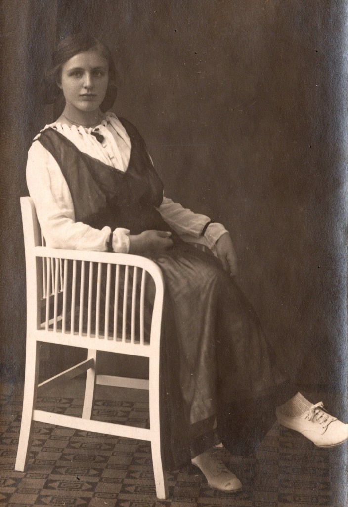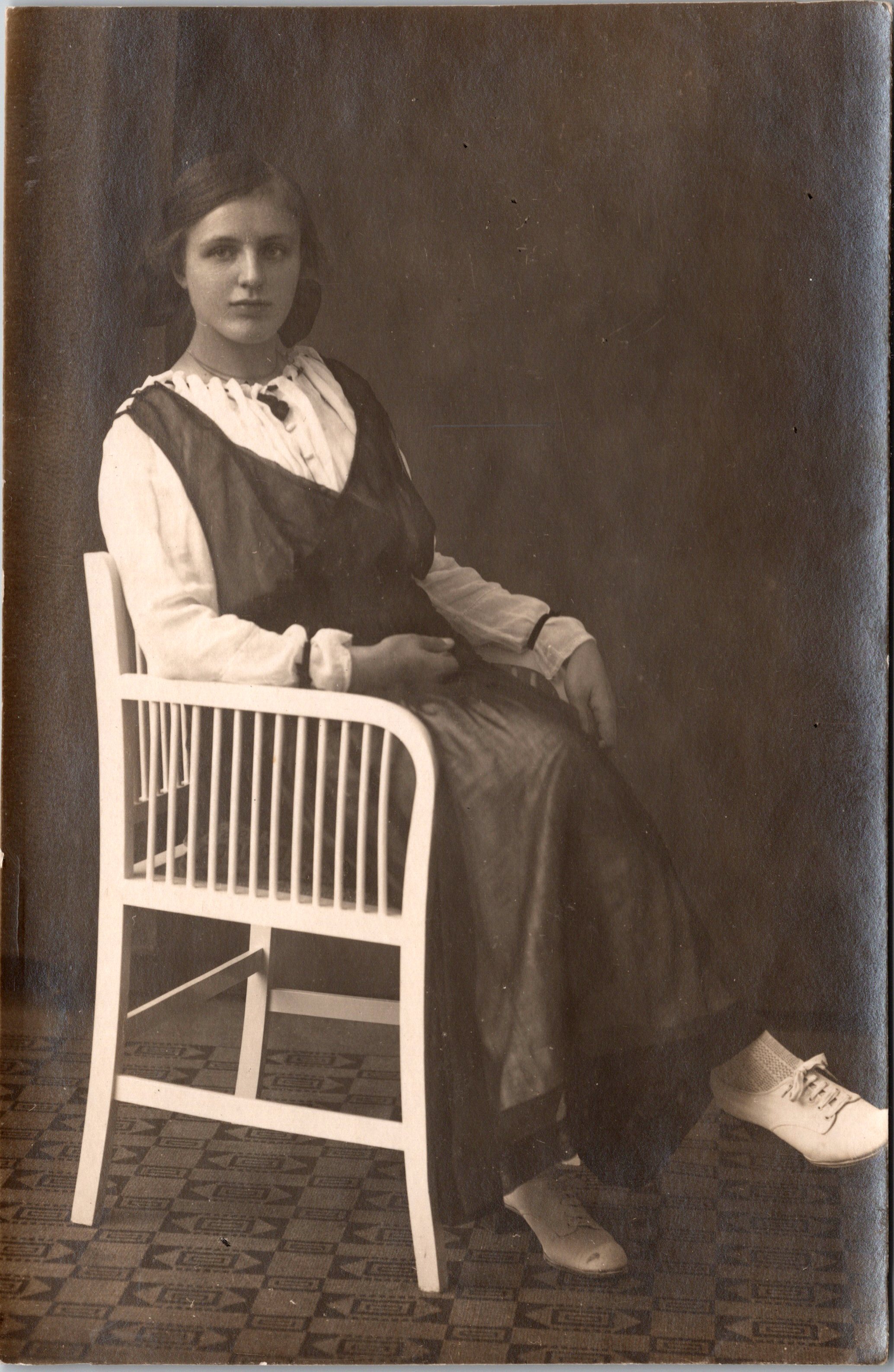This vintage real photo postcard features a pretty young woman sitting on an antique chair. Her shoes look like sneakers. This is possible because the first sneaker (running shoe) was invented in 1895. The young woman has bands around the cuffs of her sleeves which I imagine are meant to shorten the length of the sleeves. The woman appears to be in her teenage years. This divided back card dates back to around 1910. The postcard is in very good condition (see scans).