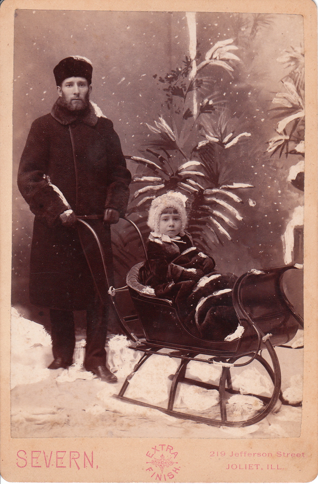 This cabinet card captures a little girl snug in her sled. Standing beside her, is her father. Both are wearing winter clothing including gloves and a warm hat. This photograph was taken inside a studio and the setting includes fake falling snow and fake snow on the ground and sled, as well as on the man and his daughter. The photographer is Severn, of Joliet, Illinois.