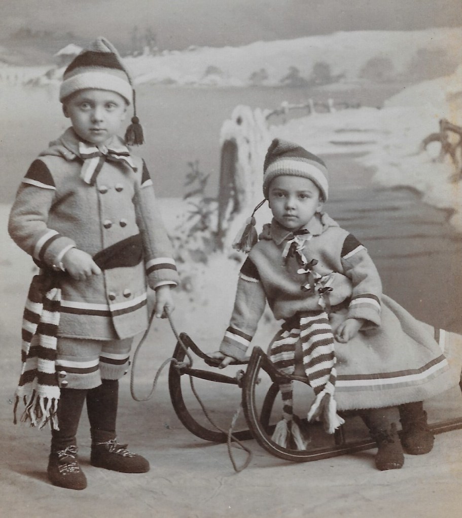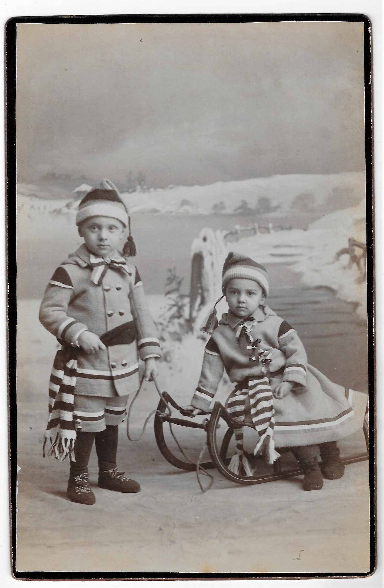 Two very well dressed children pose in their winter coats and hats at the studio of H. C. Gabriel in Philadelphia, Pennsylvania. The children are posed in a faux outdoor scene complete with snow on the ground and snow covered fences. Herman C. Gabriel is noted in the 1900 U. S. census. The census reveals that he was born in Austria in 1833. He was married in 1873 to Johanna Gabriel. He was living with his wife and 22 year-old, American born daughter, Emma. His occupation is listed as “Photographer”. Herman Gabriel is cited in the American Photographer (1916) for winning second place in a photography competition. This Cabinet Card portrait is in very good condition and has excellent clarity (see scans).