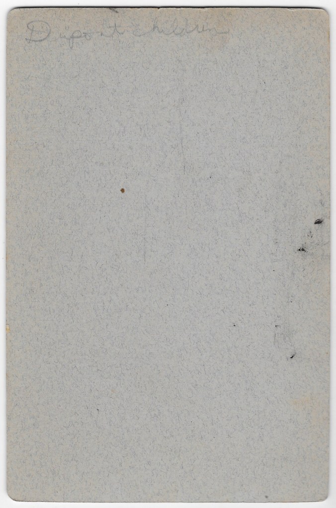 These kids are adorable and beautifully dressed. They are wearing their scarves around their waist instead of around their neck. The two kids are sporting great coats and winter hats. The oldest child hold the sled’s rope while the youngest child sits on the sled. The youngest child has many ribbons on the front of his/her coat and the bottom of his/her coat is styled as a skirt. The older child is wearing a shorts suit. Note the wintry snow covered scenery in the backdrop. The reverse of the cabinet card has an inscription stating that the kids in this photograph are the “DuPont Children” (see below). Could they be part of the famous DuPont family? The photographer’s name and the location of the photographer’ studio are unidentified. This cabinet card has great clarity and is in very good condition (see scans). Please note that my scanner did not adequately capture the sepia color of this photograph.