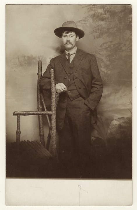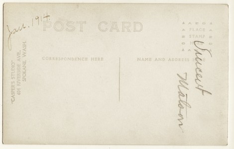 A handsome man poses for his portrait at “Casper’s Studio” in Spokane, Washington. An inscription on the reverse of this vintage real photo reveals that the gentleman’s name is Vincent Vergel Matson (1885-1978). Matson dressed up for this photograph. He is wearing a western vested suit and western hat. Matson was born is South Dakota. The 1900 US census finds him living with his family on the Blackfoot Indian Reservation in Teton, Montana. The 1910 census lists him as living in Edwards, Montana and working as a farmer. By 1920, he moved again. This time he was residing in North Bonners Ferry, Idaho and working as a laborer. He was still working as a laborer at the time of the 1930 census and he was living in a Boarding House in Spokane. He was living in Kalispell, Montana at the time he registered for the draft in 1942. He was listed in the 1943 Kalispell directory as a laborer. At the time of Matson’s death in 1978, he was living in Beaverhead, Montana. My research did not find any record of Matson ever marrying. One has to wonder if Matson was a bit of a drifter. He appears to have moved around a lot, not letting the grass grow under his feet. He had no wife or kids, and could take on labor work wherever he lived. This postcard has an AZO stamp box indicating that it was produced between 1904 and 1918. (SOLD)