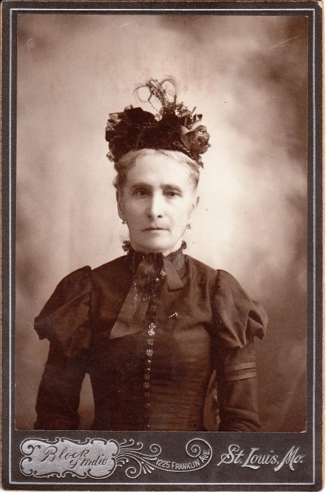 This cabinet card features a very fashionably dressed older woman posing for her portrait at the Block Studio, in St. Louis Missouri (1225 Franklin Avenue). The woman is wearing a very interesting hat that includes feathers and assorted other materials. She is wearing a pin and earrings. Research indicates that Louis Block worked as a photographer in St. Louis between 1900 and 1919 although he may have also worked there during other additional years.
