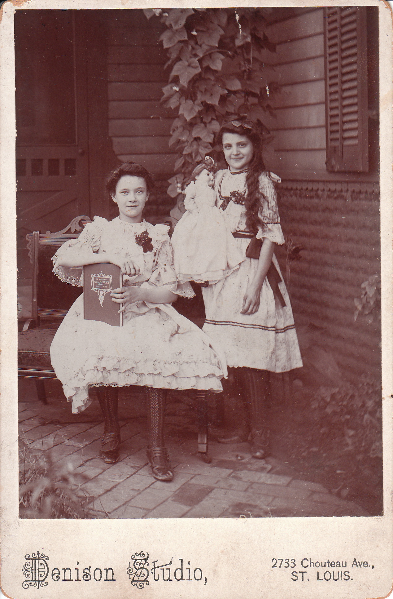 This cabinet card features two young girls posing in front of a nicely landscaped house. The house may actually be just part of a house, and serve as a prop inside the photographic studio of Mr. Denison, in St. Louis, Missouri. One girl, with long braids, is holding a doll. The second girl is holding something very unusual for a child to be displaying, That is, unless she is an aspiring home builder. This girl is proudly brandishing a 1902 catalog from the William G. Frye Company. This business was located in St. Louis, and sold door, sash, blinds and many types of millwork. In regard to Mr. Denison, no information was found about him except that his Chouteau Avenue address (about 1900) was followed by a move to 1452 Cass Avenue (about 1906), also in St. Louis.