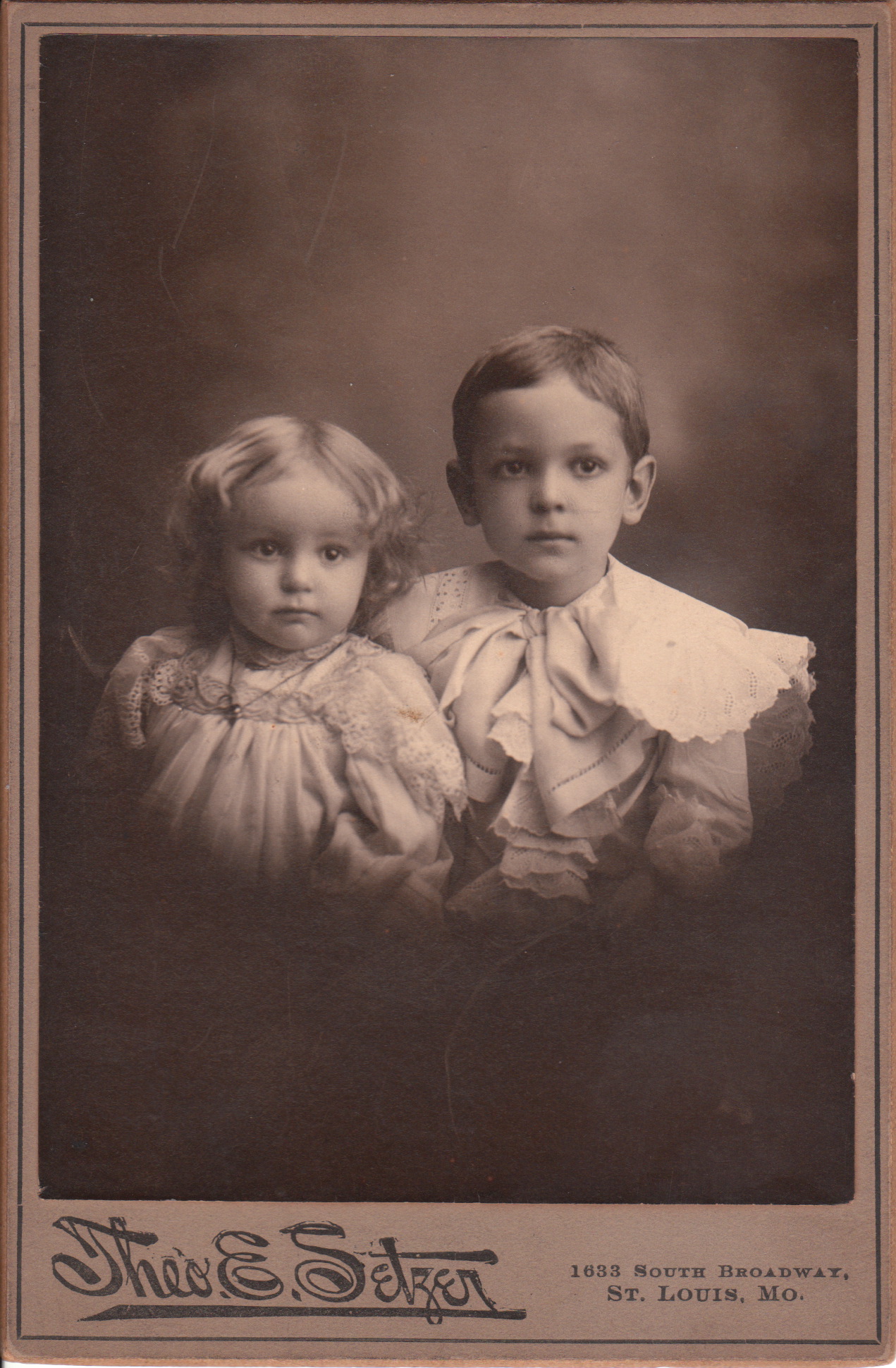 This cabinet card features adorable siblings posing for their portrait at the Setzer studio in St. Louis, Missouri. The photographer is Theodore E. Setzer. Setzer operated his studio from the South Broadway address from about 1890 until 1910, according to one photographer reference book. Between 1885 and 1890 he conducted business from that address as Setzer & Roth.
