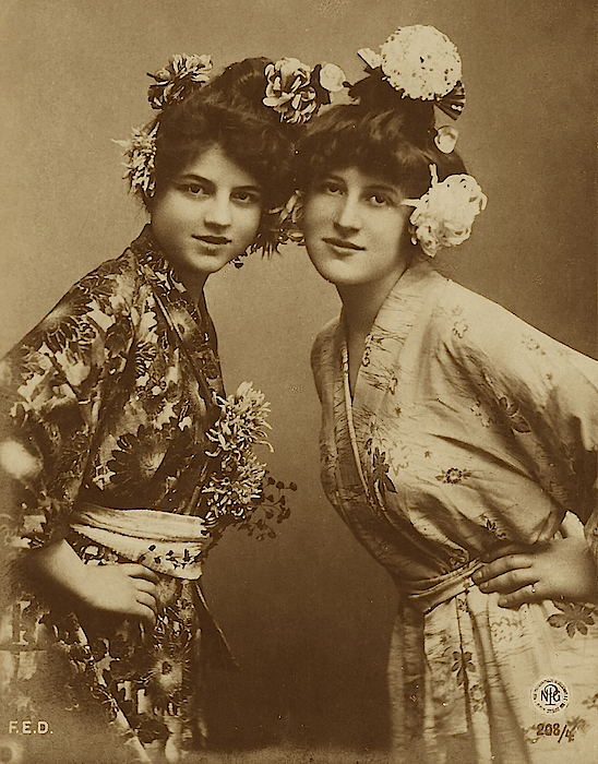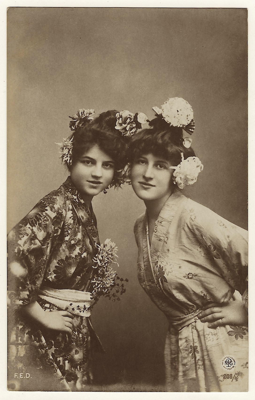 This vintage real photo postcard features two very pretty young women wearing kimono type dresses or robes. The fabric patterns are beautiful. Occasionally, I encounter cdv’s, cabinet cards, and postcards featuring women wearing kimonos. These early photographs document that kimono popularity in the western world was evident as early as the 1880’s. The postcard was published by “NPG” (Neue Photographische Gesellschaft) as part of a series (no. 208/4). The company was a leading bromide photo printing company for many years. A. G. Steglitz, is also noted as the publisher and this photo was published circa 1905 in Berlin, Germany. Note the initial “F. E. D.” at the bottom of the image. The initials stand for Friedrich Eyfried, the printer of this card. The company was located in Dusseldorf, Germany. This postcard is in good condition. Note the slight discoloration in and near the bottom left hand corner of the card. SOLD
