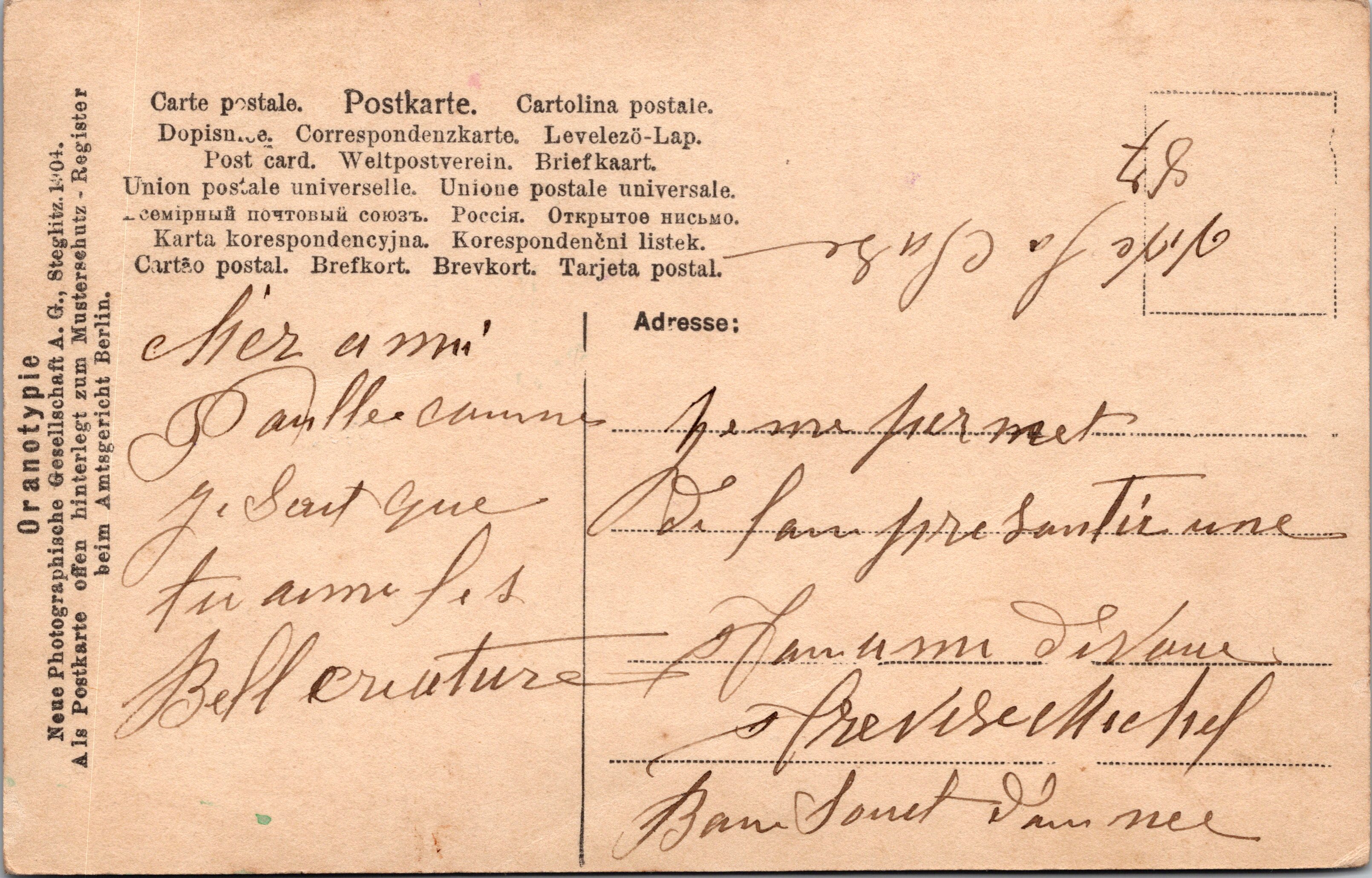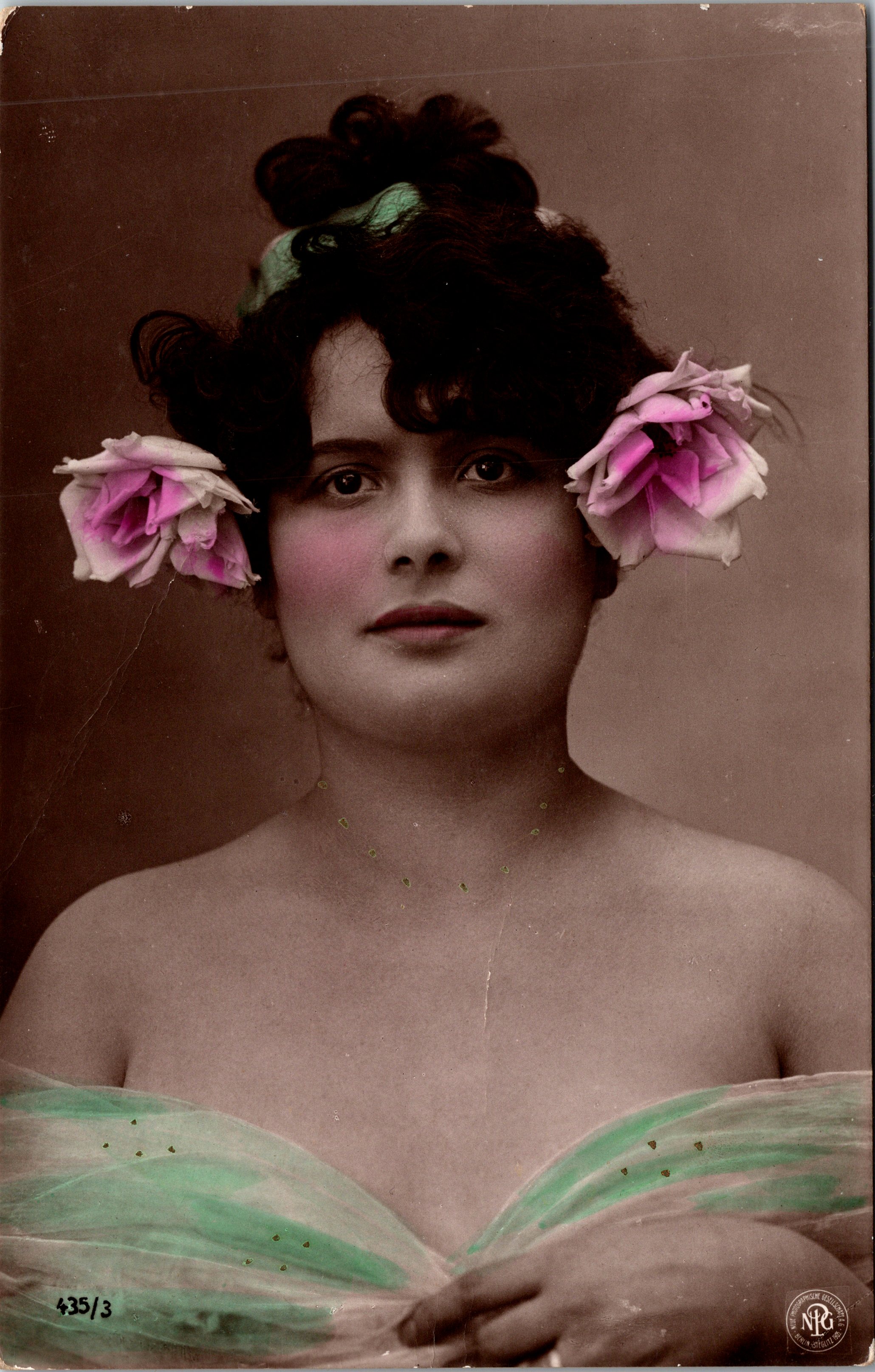 This is a striking hand-tinted real photo postcard (RPPC) featuring a young actress or performer seated confidently on a chair. The card is part of the NPG (Neue Photographische Gesellschaft) series, serial number 645/2, and dates to 1904. It was printed in Berlin, Germany, as indicated on the reverse. The woman in the image has voluminous, dark, curly hair adorned with colorful ribbons, one pink and one lavender. She wears a bold theatrical costume: a bright turquoise satin dress trimmed with cream-yellow ruffled sleeves and skirt, accented by a vivid red flower at the bodice. The layered ruffles of her skirt spill over her lap, giving her a lively, almost playful stage presence. She sits with her legs crossed, her expression calm and slightly defiant, exuding poise and self-assurance. Her dark stockings and buttoned heels complete the look, emphasizing her identity as a stage performer rather than a conventional society portrait sitter. Neue Photographische Gesellschaft A.G. was a leading German postcard and photographic publishing house active in the early 20th century. The left-side imprint, translated, reads: “Original photograph by NP Steglitz refers to the Berlin district where NPG was located, not the photographer’s surname. On the reverse, the postcard carries a green French stamp, confirming that the card was mailed from France, even though it was printed in Germany. The stamp is from the French “Sower” (La Semeuse) series, first issued in the early 20th century. The message on the card, translated from French reads: “Guess who is sending this to you.” SOLD