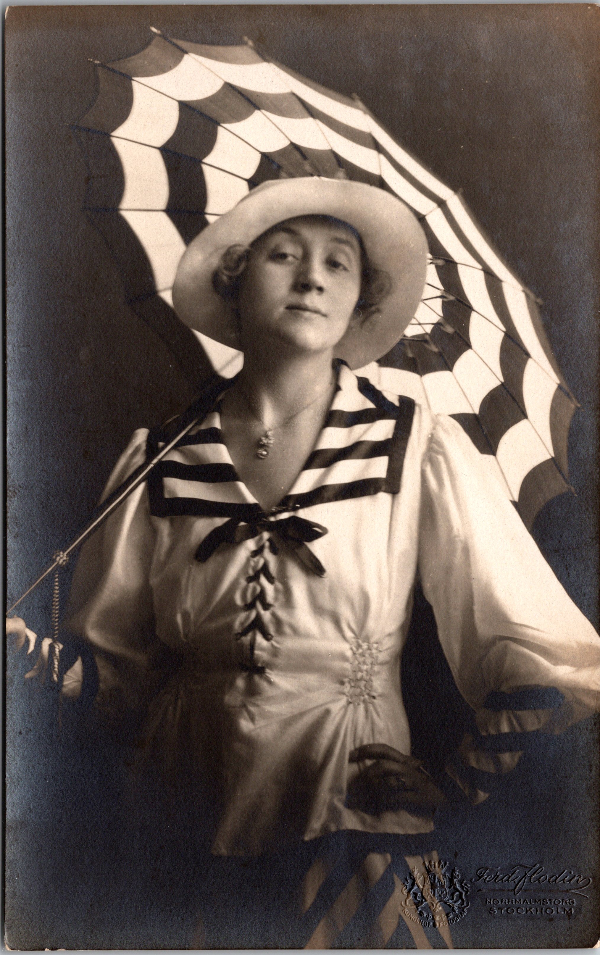 This cabinet card is a family portrait of a nicely dressed young couple and their baby. Mom and dad are wearing flowers and mom appears to be holding a cane or umbrella. The photograph was produced by the Flodin & Thyberg Photographic Art Studio in Worcester, Massachusetts. The photograph is dated 1889. Photographer, Ferdinand Flodin was born in Stockholm, Sweden in 1863.He came to America in 1883 and studied photography in Boston with a well known photographer named Ernest Ritz. He then studied under renowned Boston photographer, William Notman. He moved to Worcester in 1887 and partnered with August Thyberg in opening a gallery. After a time, Thyberg withdrew from the business. Flodin was a very productive writer. He had several articles published in photography journals. He also wrote an illustrated book on Sweden. In addition, he wrote an article which appeared in “Photographic Mosaics: Annual Record of Photographic Progress” (1895). The article was entitled “Our Reception-Room Showcase”. The Wilson Photographic Magazine (1903) reported that Flodin returned to Sweden in 1898 and operated a studio in Stockholm. The magazine article includes some excellent photographs of the Swedish gallery. August Thyberg was born in Sweden in 1863. He immigrated to the United States in 1884. His wife, Alma, was also Swedish. The United States census provides further information about Thyberg. In 1900, he was living in Minneapolis, Minnesota, and working as a merchant. In 1910, he lived in Springfield, Massachusetts and worked as a blacksmith. In 1920, he lived in Minneapolis and owned a shoe business. The 1930 census finds Thyberg retired in Minneapolis. It is safe to say, that unlike his one-time partner, Flodin; Thyberg had a difficult time sticking to an occupation. To view more photographs by this studio, click on the category “Photographer: Flodin & Thyberg. (SOLD)