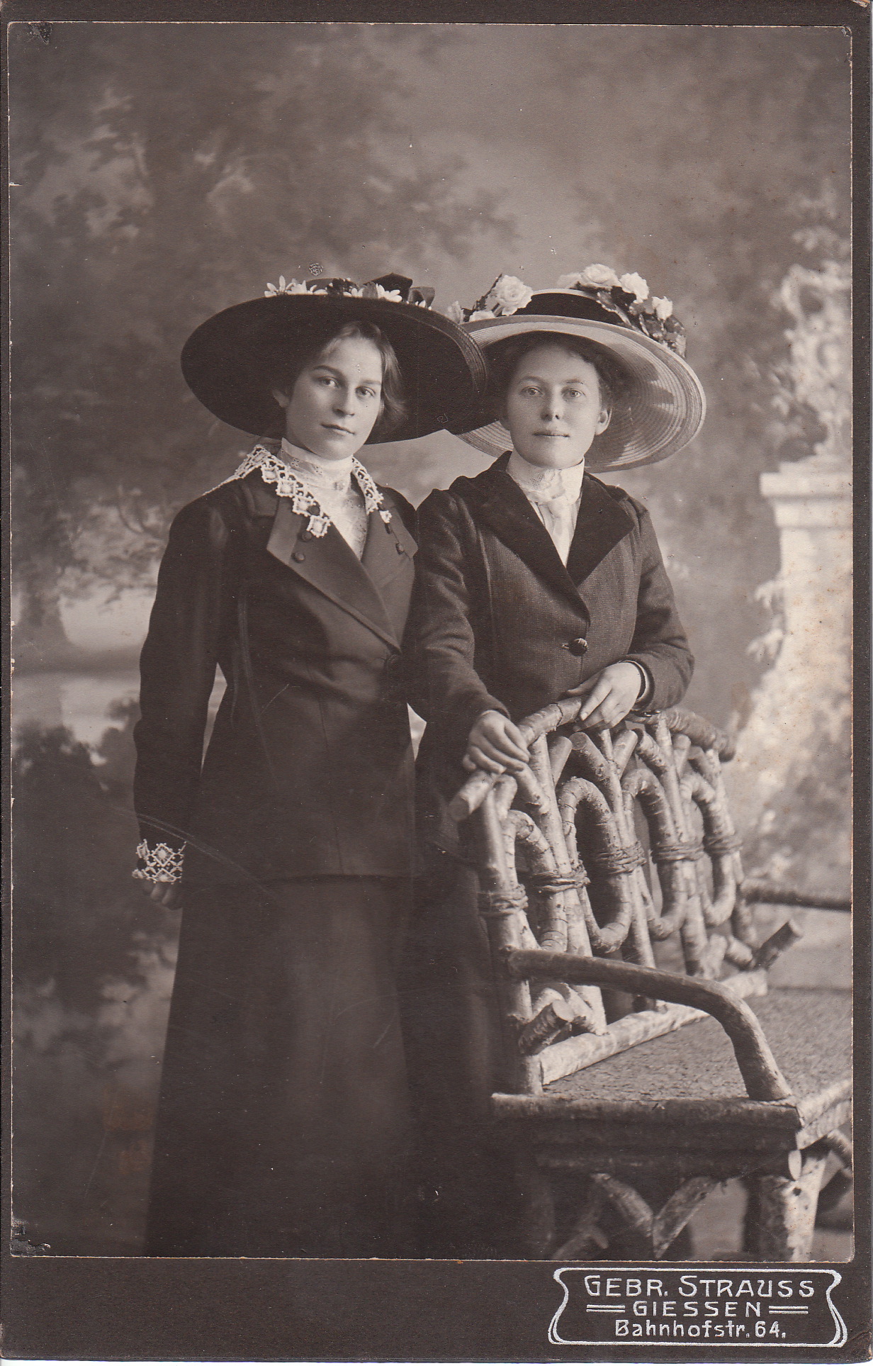 Two attractive women pose for their portrait at the studio of the Strauss Brothers, in Giessen, Germany. These ladies have a flair for fashion and apparently the financial wherewithal to support their fine taste in apparel. The woman are attractive and dressed beautifully. Note their fine hats. An inscription on the reverse of the image indicates that the image was photographed in 1912.