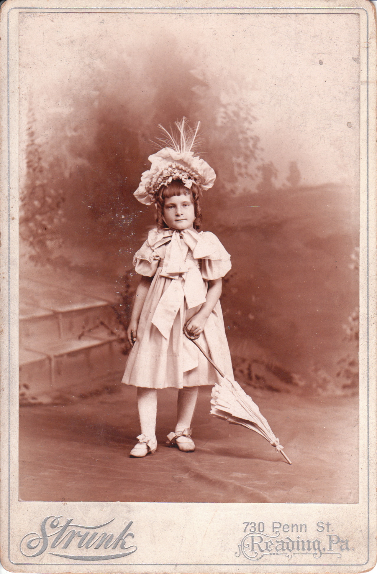 An adorable little girl with sausage curls, a fancy dress and a little parasol poses for her portrait at the Strunk studio in Reading, Pennsylvania. She has a very serious expression but looks very sweet. To view other photographs by photographer John D Strunk and to learn more about him, click on the category “Photographer: Strunk”.
