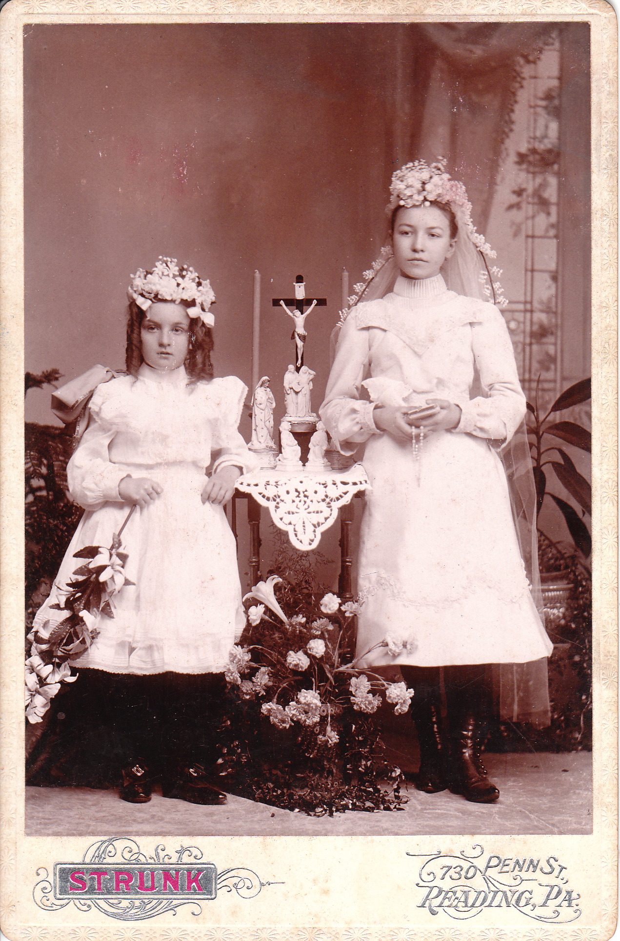 This cabinet card features two young girls participating in a religious ceremony, Note the religious symbols on the table between them. The girls are dressed in their finest clothing and adorned with flowers. The photograph was produced by John D Strunk of Reading, Pennsylvania. Several of his images can be found in the cabinet card gallery and to learn more about him, and to view the other photographs, click of the category “Photographer: Strunk”. Perusal of his other images reveal that Mr. Strunk was an excellent photographer. The image above has great clarity, the subjects are well posed, and the props are perfectly placed.