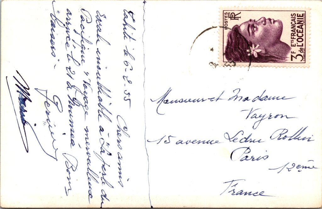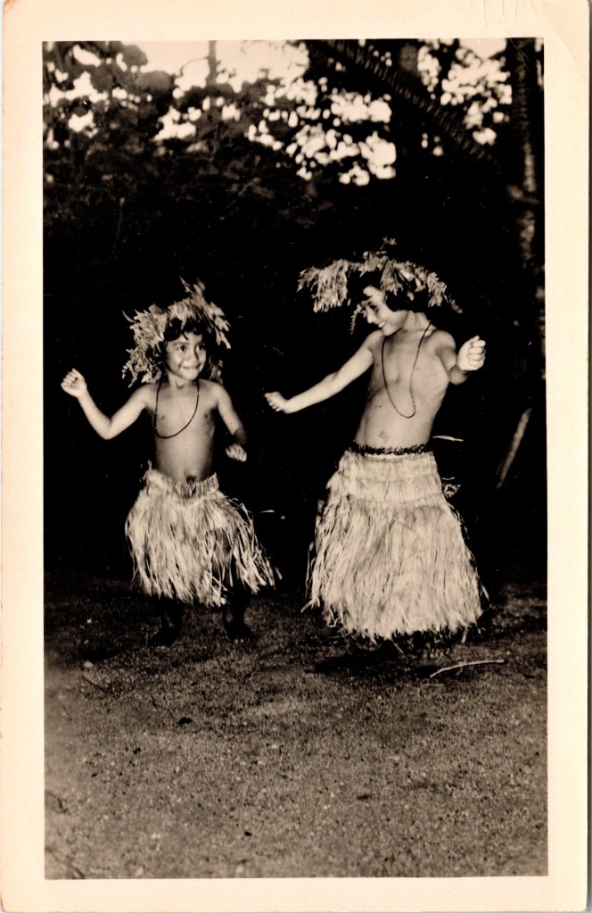 This vintage real photo postcard features two children hula dancing. They are wearing grass skirts as well as infectious smiles. This postcard photo was taken in French Polynesia). More specifically, the setting is Tahiti, and the year is 1955. Note the card’s French Polynesia postage stamp. (SOLD)
