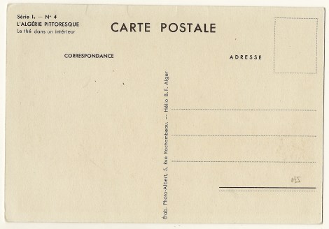 This vintage ethnographic photo postcard features two pretty semi-nude Algerian women. They are wearing traditional garb of their culture. The women appear to be preparing for some tea. The postcard is from circa 1930’s. Google translate reveals that the caption on the reverse of the postcard states “Picturesque Algeria. Tea in the interior”. The card is part of a series (Serie I. – No 4). The photographer of these ladies has the last name of “Albert”. This vintage postcard measures about 5 3/4″x 5 7/8″. (SOLD)