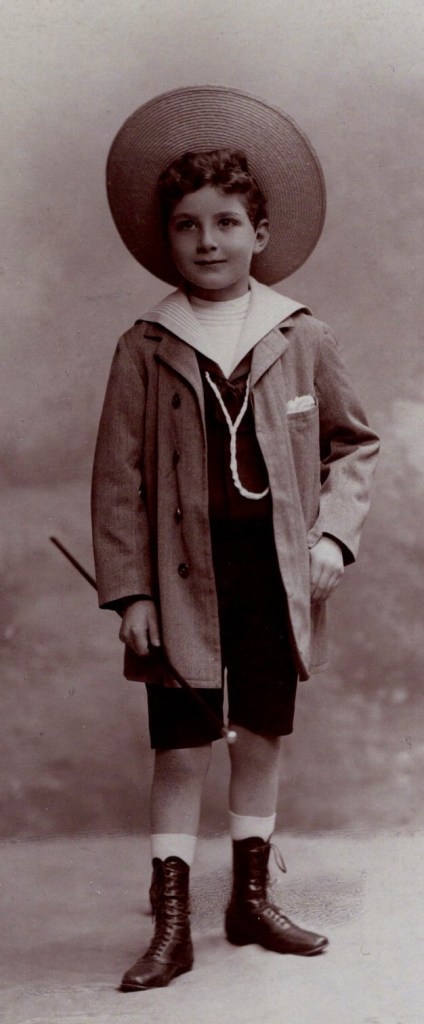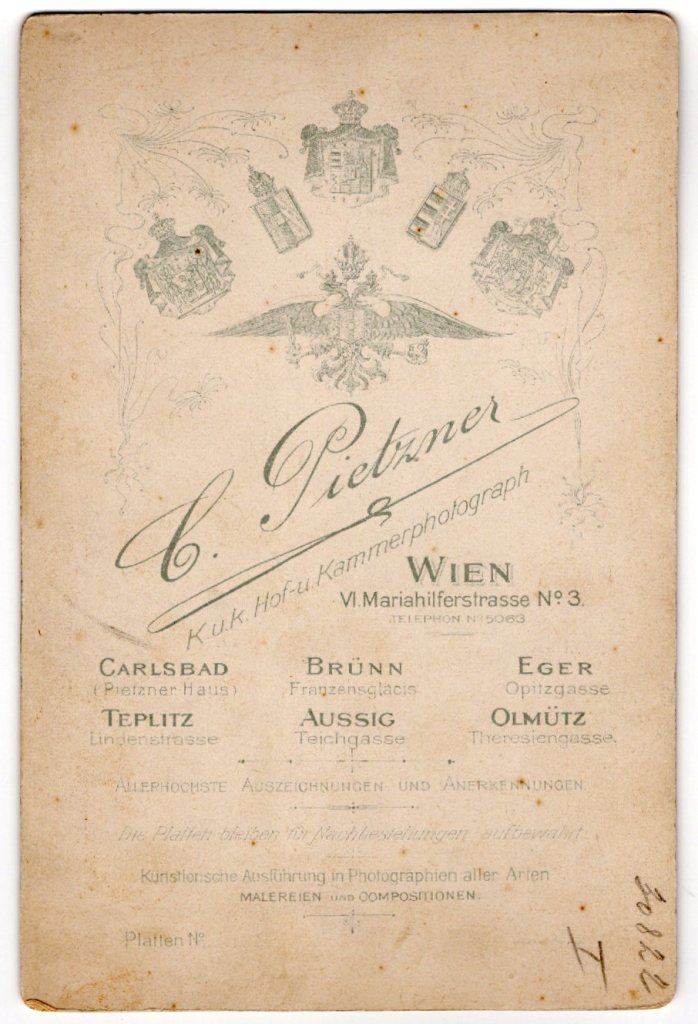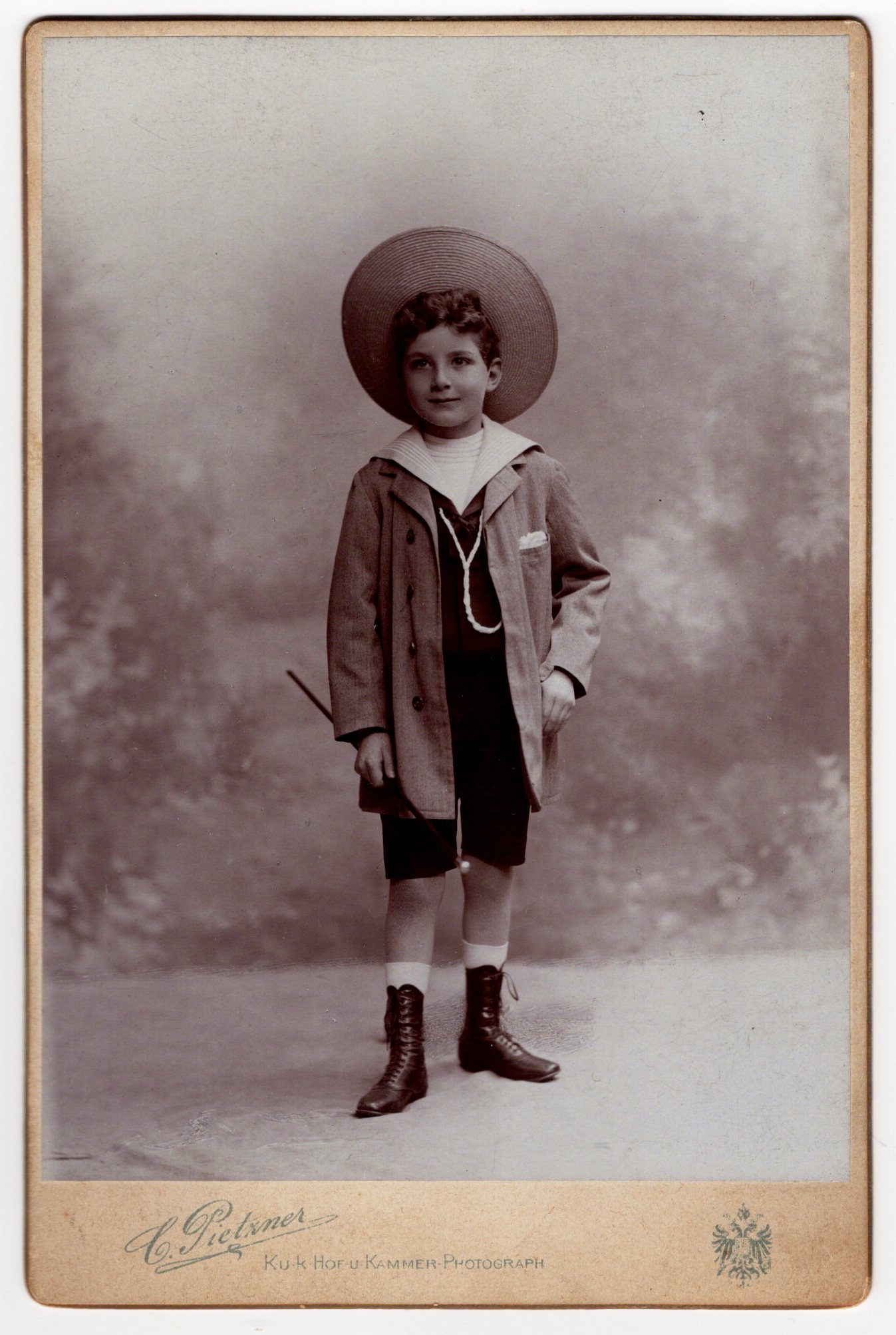 This cabinet card photograph features a very fashionable  young boy, posing at the studio of Karl Pietzner in Wien (Vienna), capitol of the Austro Hungarian Empire. The young boy is wearing a sailor type blouse, boots, a straw hat, and holding a stick. Pietzner (1853-1927) was born in Prussia and is known to have worked as a photographer from 1877 until 1924 and he worked throughout Europe. At the time that this cabinet card was photographed, he had studios in Wien, Carlsbad, Brunn, Eger, Teplitz, Aussig, and Olmutz. The New  York Times (1899) printed an article about his photographic research work in the production of reliefs. He invented a process he named “plastophotography”.  He was a photographer for the Royal family in Austria. He did portraits of Franz Joseph. Pietzner was certainly a celebrated photographer and this cabinet card is a great example of his work. This cabinet card portrait is in very good condition (see scans).
