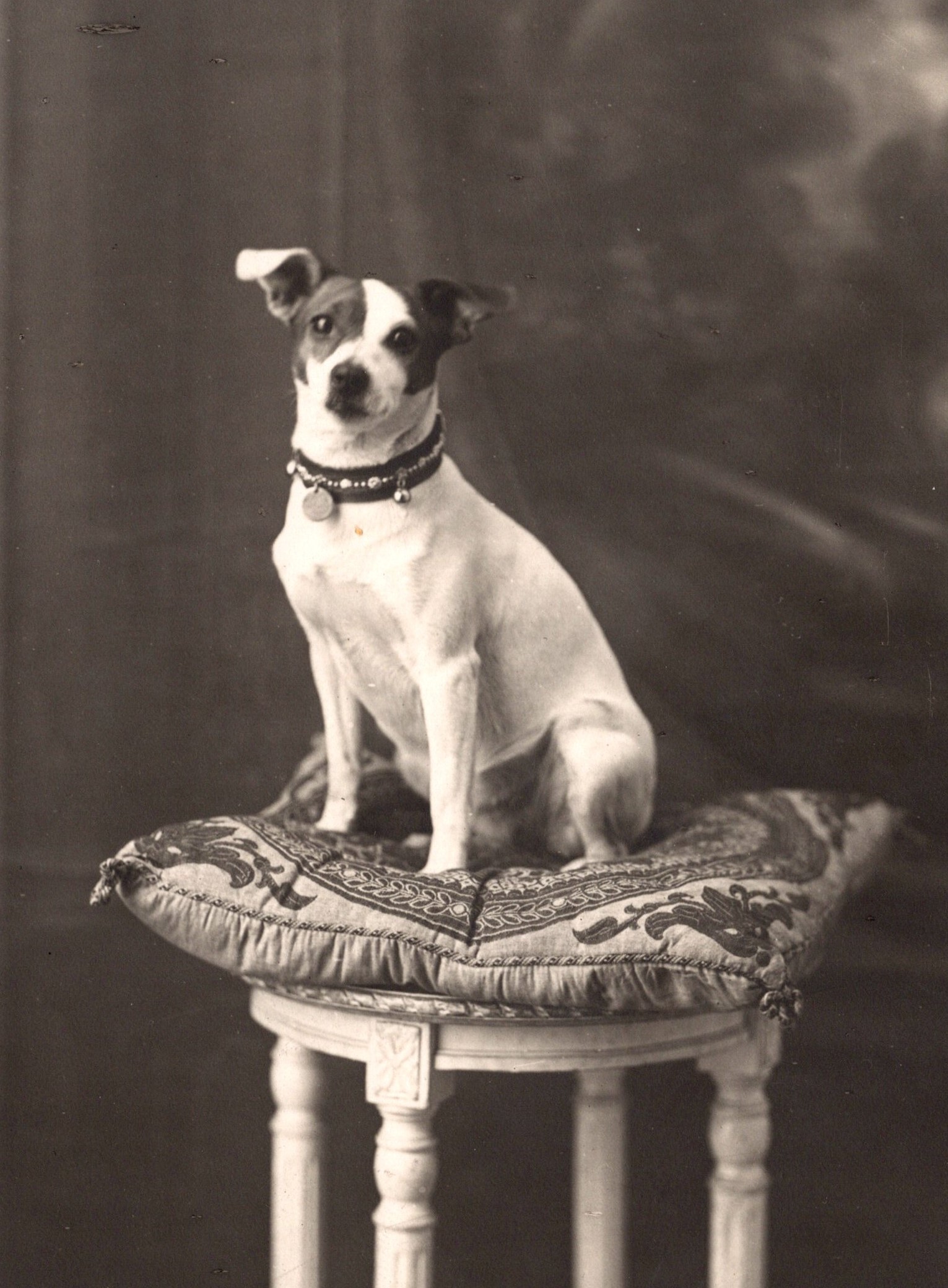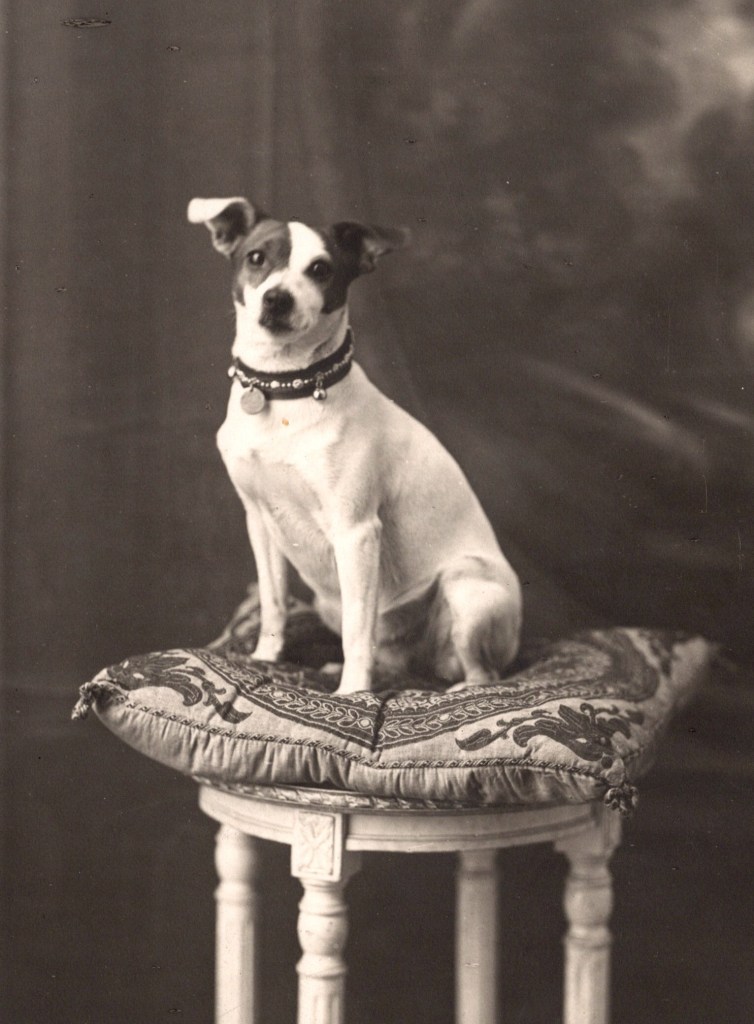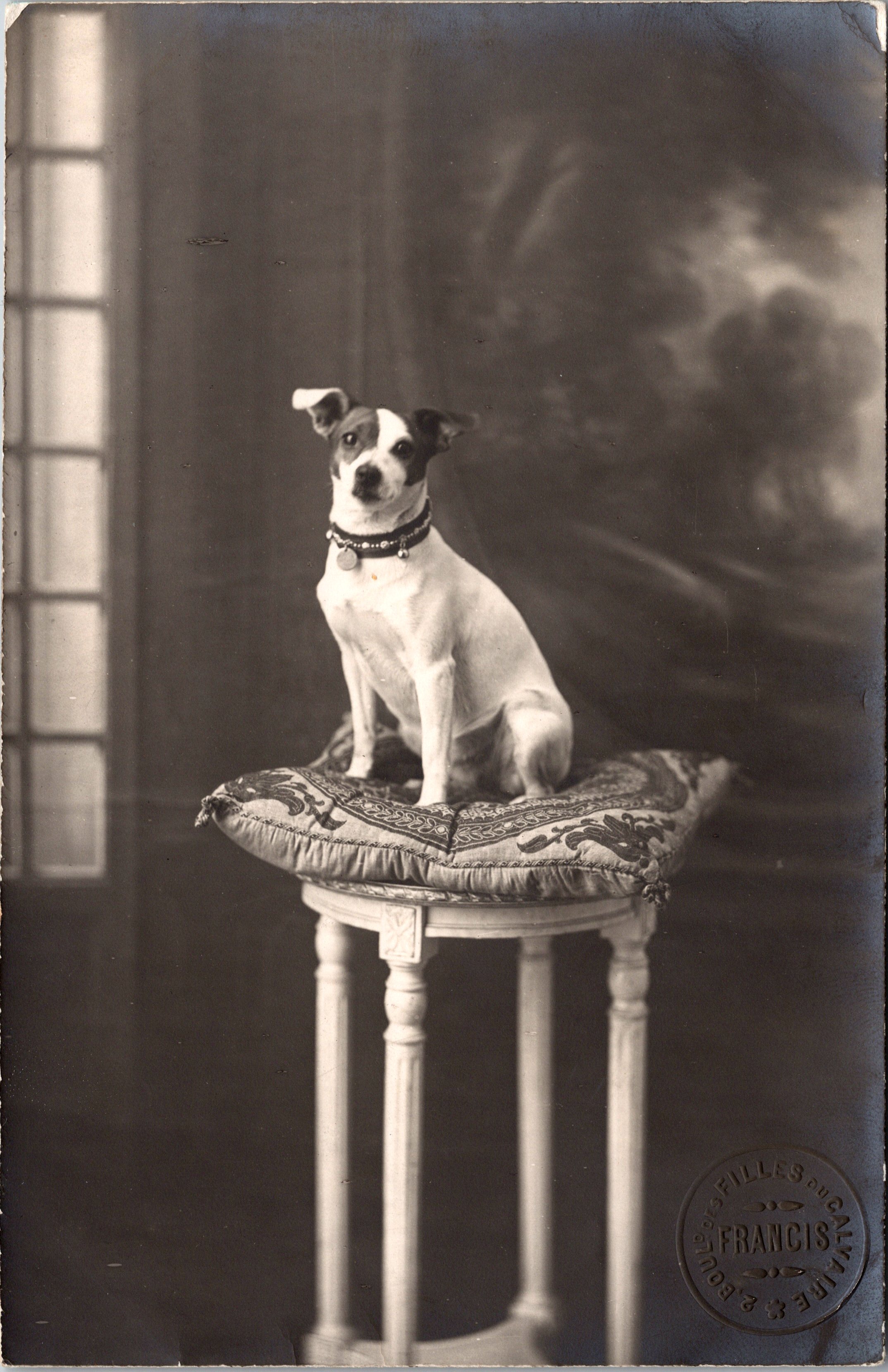 This vintage real photo postcard features an adorable Jack Russell Terrier sitting on a pillow atop a table. The dog looks alert and ready for action. The terrier is wearing a wide collar with an attatched dog tag. The photographer did an excellent job of posing and shooting the photograph of this expressive canine. The photographer of this image was located in Paris, France. The name of the studio is embossed on the bottom right hand corner of the card. (SOLD)