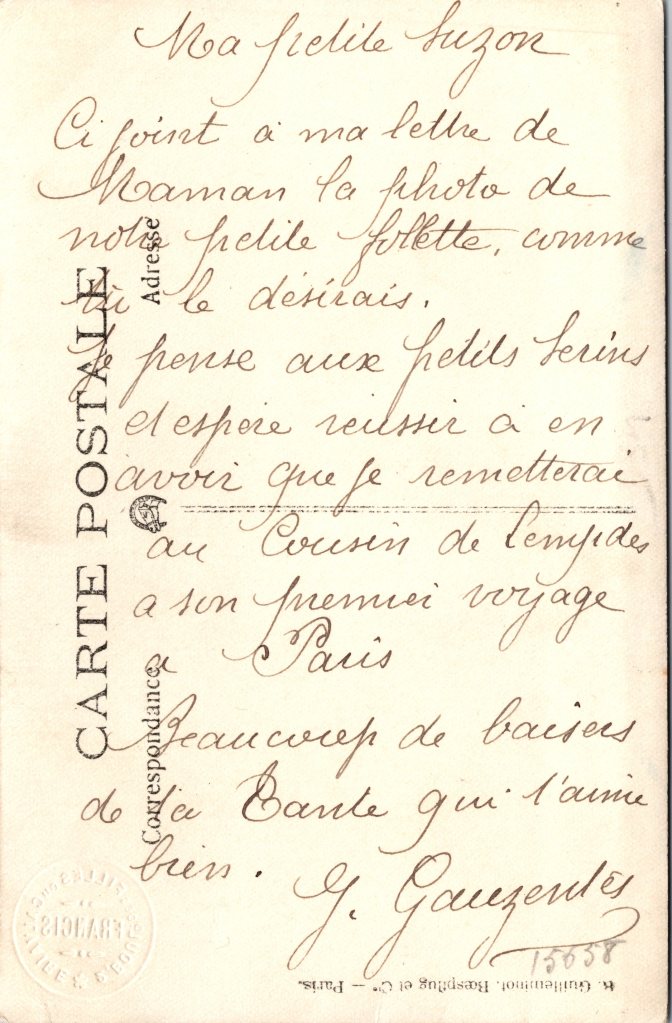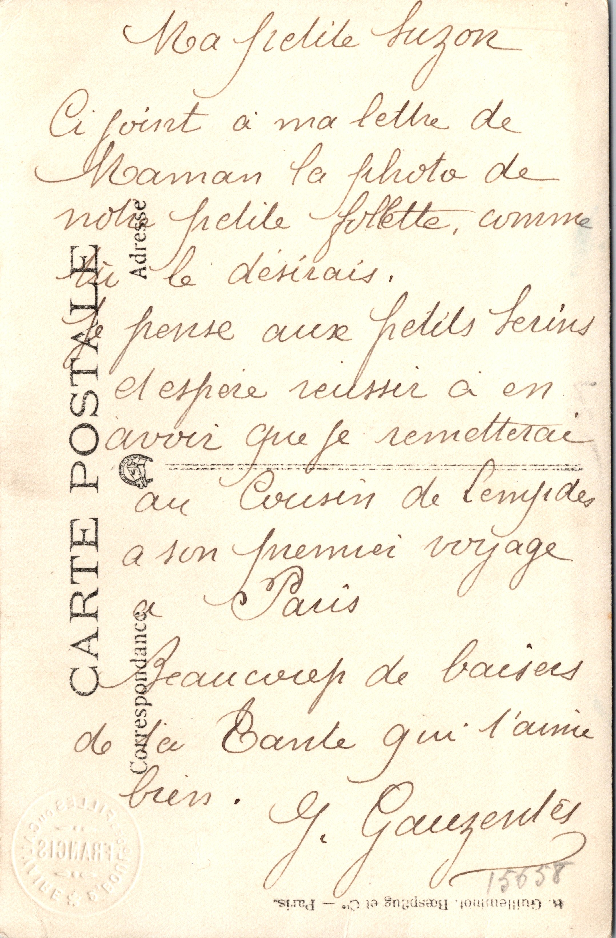 This vintage real photo postcard features a pretty young woman, attractively dressed, posing at an unidentified studio for her portrait. She is accompanied by her very expressive dog. The dog appears to be a Jack Russell Terrier. The initials “HT” are printed on the bottom left hand corner of the image. “HT” is likely the publisher of the card. The postcard has a French stamp and was postmarked in 1910. SOLD