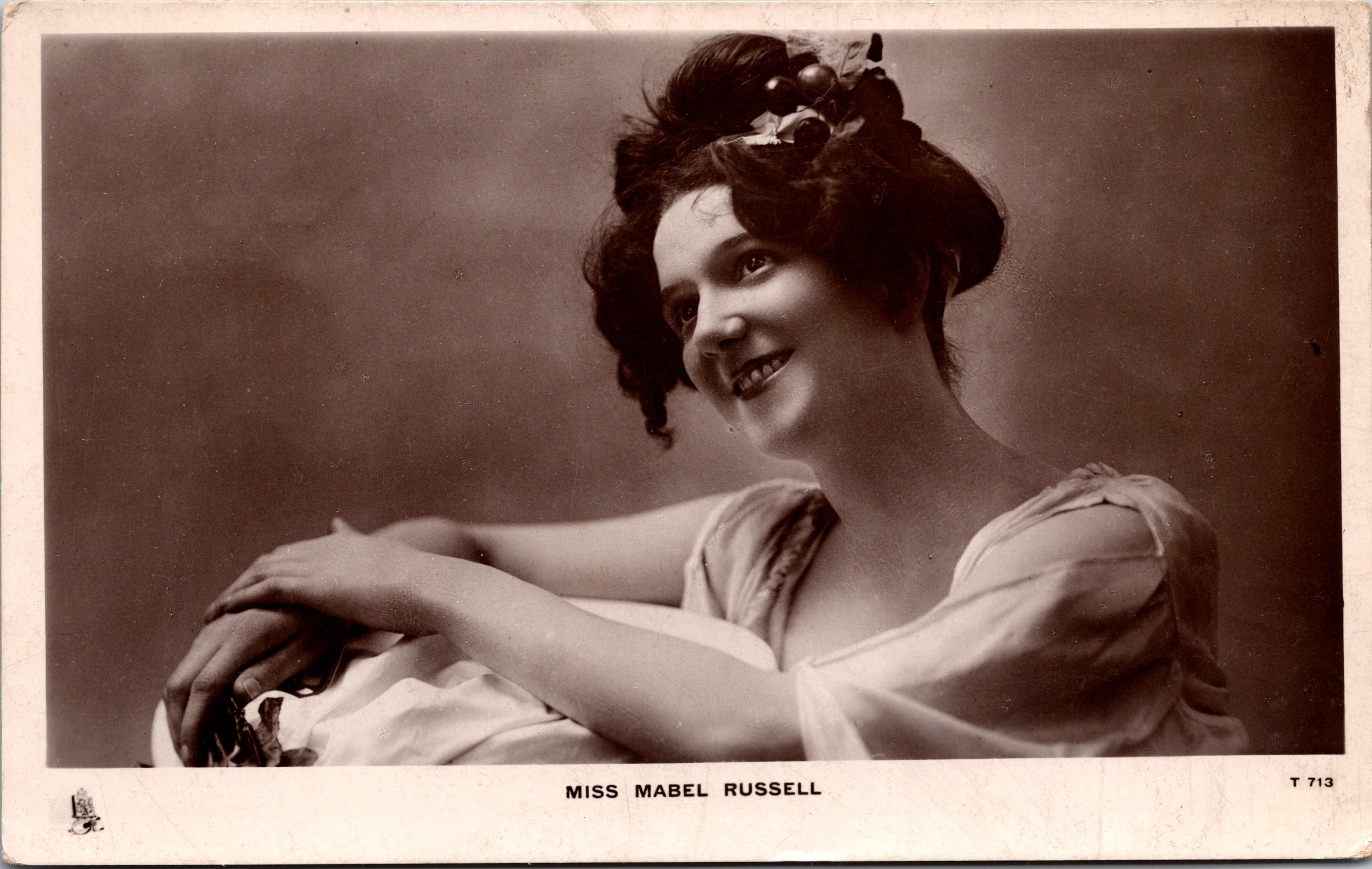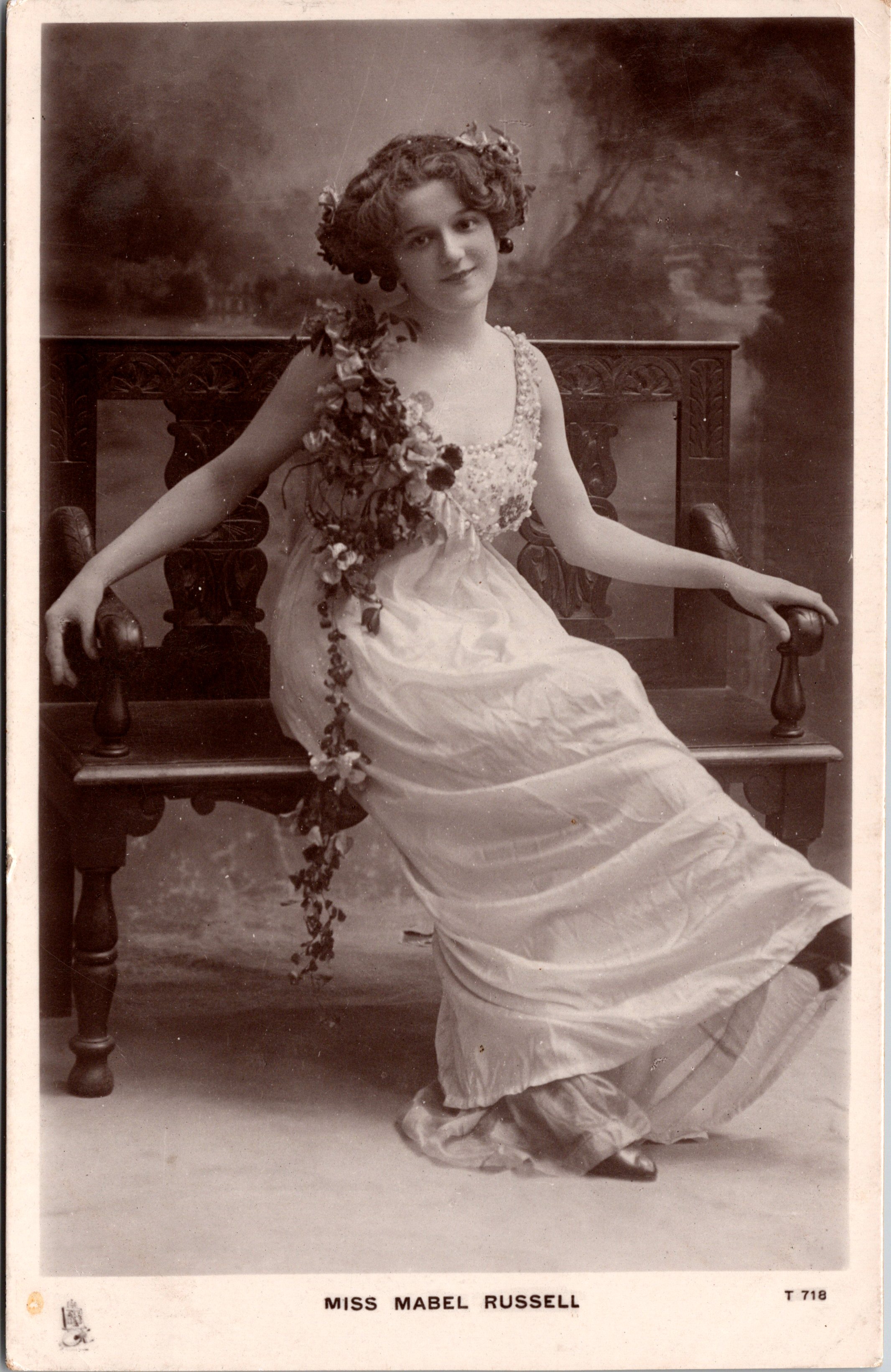 This uncommon vintage real photo postcard, (Postcard 1), features American stage actress, Olive May (1871-1938). She was born in New York City. May made her stage debut in 1893 and quickly became a popular leading lady. She appeared in a number of successful plays, including “Arizona” (1900), “The Merry Widow” (1907), and “The Girl from Utah” (1911). She also was noted for appearing in Maude Adams company and for her Shakespearian roles. The IBDb reports that May appeared in 21 Broadway plays between 1894 and 1928. May was also a popular singer. She was married twice. She had a four year marriage to playwright Henry Guy Carleton and a three year marriage to actor John Albaugh Jr. Widowed at 39 years of age, she never married again. Besides being a talented actress, May was known for her beauty. Many consider her to be one of the prettiest of the real photo postcard actresses of her time. Her beauty is evident in this postcard. She appears to be in costume for one of her theatrical roles. Note her intricate headdress. She is posing with a a copy of “The Bystander” magazine. The magazine began publication in 1903 and covered topics such as theater and literay news, politics, and sports. The magazine also included short stories and cartoons. In 1940 the magazine merged with “The Tatler”. This postcard was published by Rotophot and printed in Germany. Also listed as a publisher was Giesen Brothers & Co. (London). The photograph of Olive May seen on this card was taken by Dover Street Studios. (SOLD)