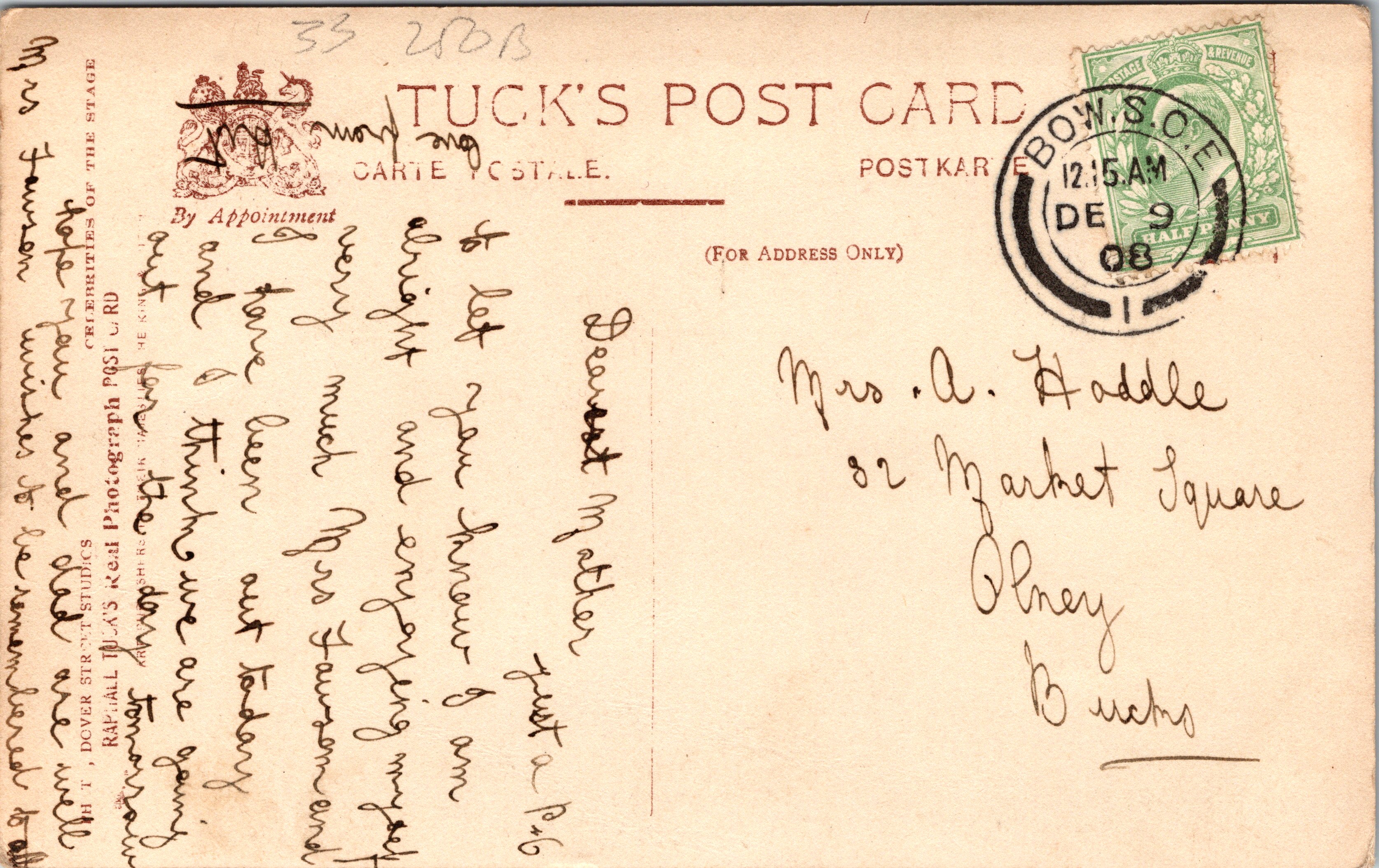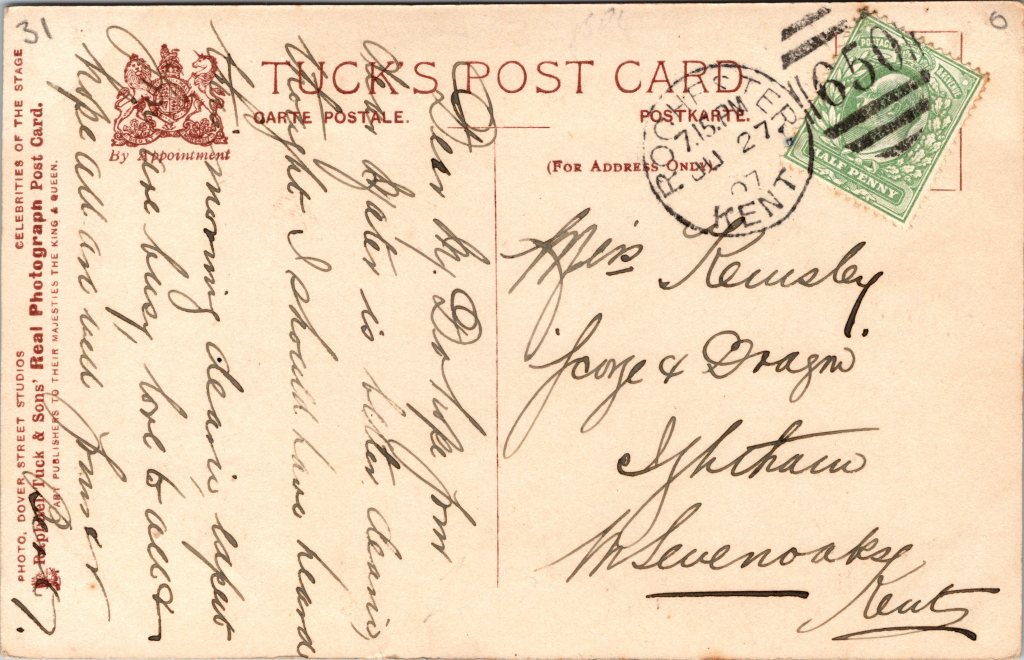 Postcard 3 displays the beauty of Olive May. The photograph on this card captures her in costume for one of her theatrical roles. Note her long white gloves. This postcard was published by Raphael Tuck (No.1727S) as part of the “Celebrities of the Stage” series. It was printed in Great Britain. (SOLD)