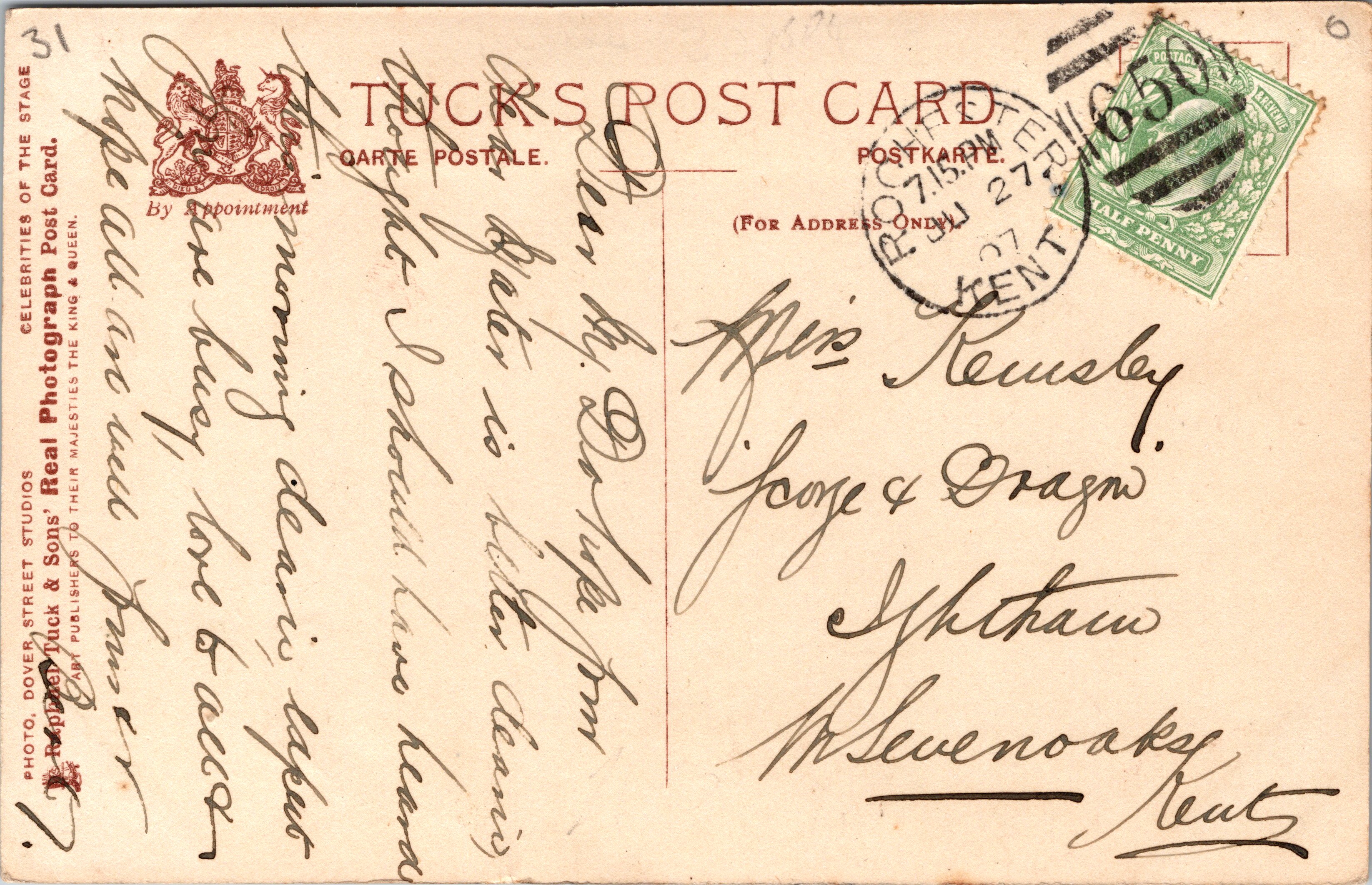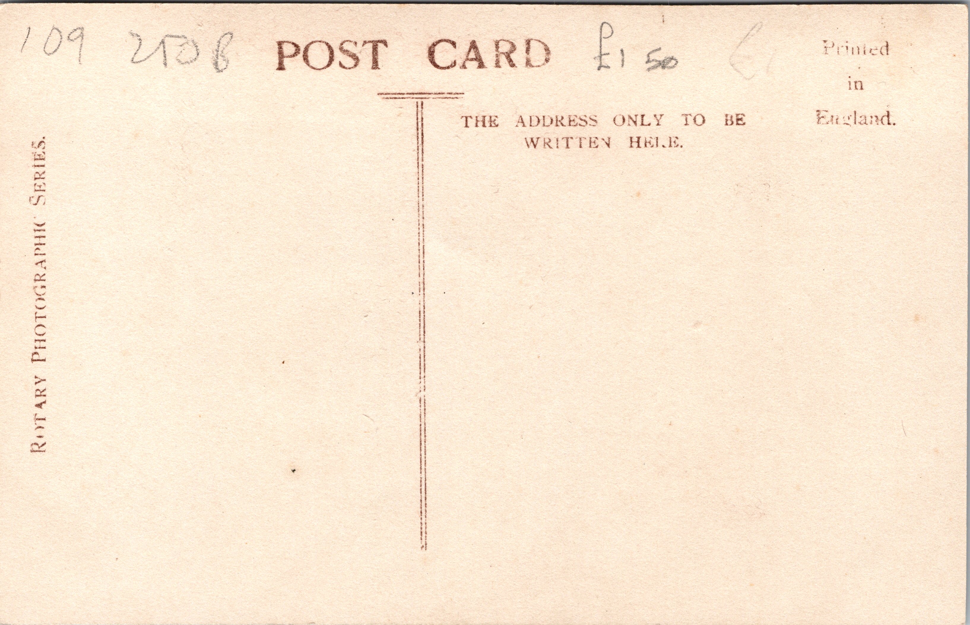 Postcard 6 features May in costume for one of her theatrical roles. Note her pretty lacey dress and hat. Miss May’s pose is atypical. She is sitting on a barrel/table. She has a wonderful smile. This postcard was published by Rotary Photo as part of a series (No.1727K). It was printed in Great Britain. Olive May’s photograph was taken by Dover Street Studios. (SOLD)