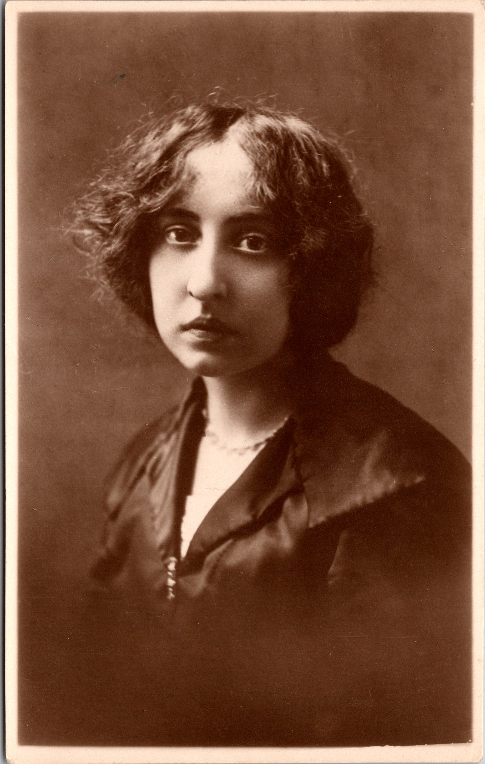 In Postcard 2, Miss Ward’s expression, and her act of biting the strand of pearls, appears more flirtatious than innocent. The photo portrait used for this postcard was taken by Dobson Studios which was located in Liverpool, England. This postcard was likely published by Rotary Photo. I hold this hypotheses because the printing on the reverse of the card matches the design of many Rotary Photo postcards. (SOLD)