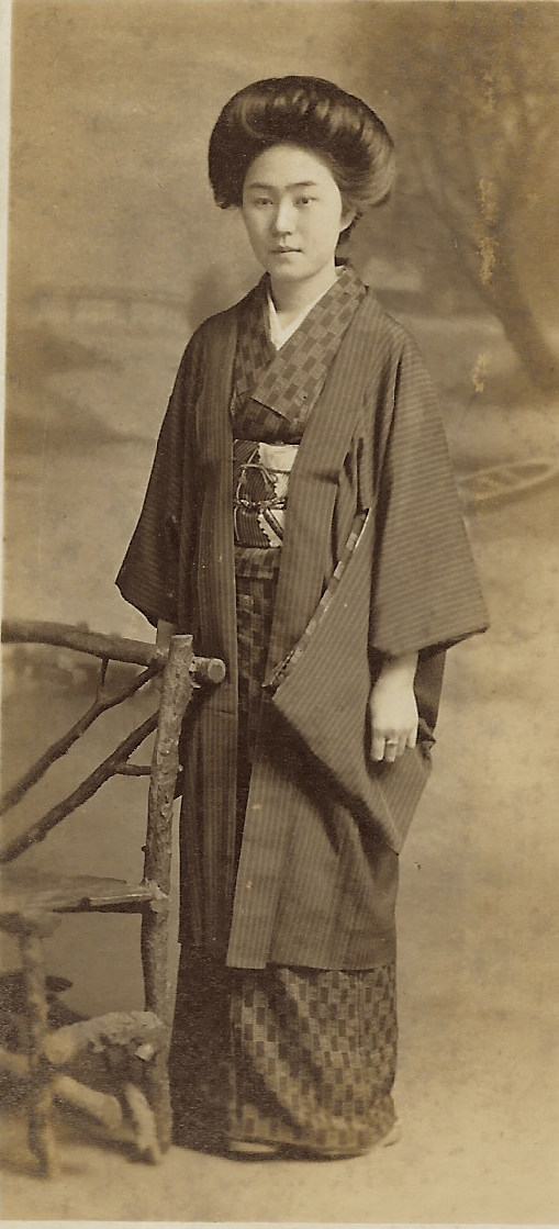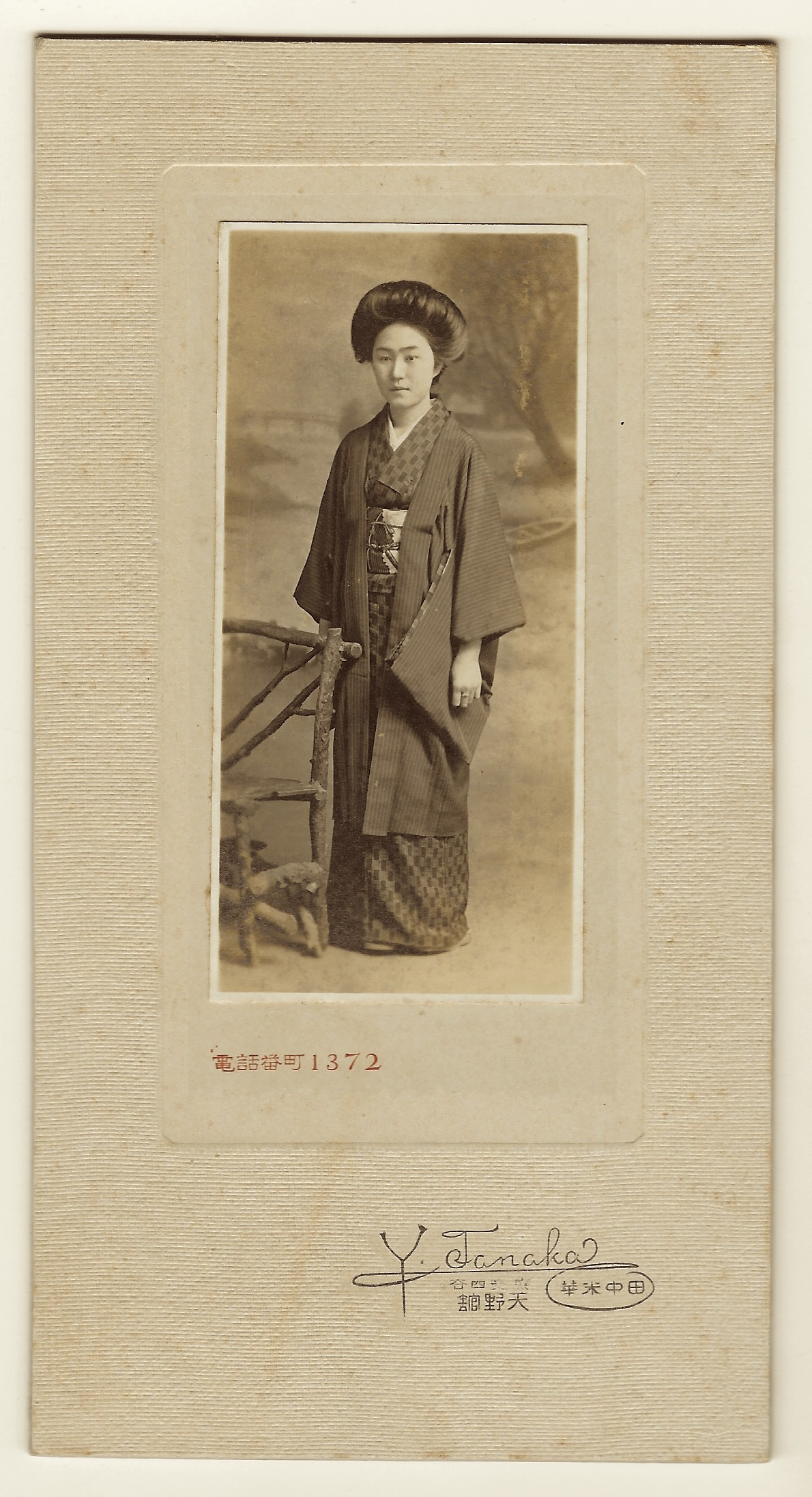 This vintage real photo postcard features a beautiful Oiran Courtesan accompanied by her young assistants (kamaro). What is an Oiran? An Oiran is a high class, beautiful and esteemed prostitute in Tokyo. Her assistants are often apprentices; in other words, future Oirans. How are Oirans different from Geishas you may ask. Geishas are highly trained entertainers. They entertained via song, dance, or playing a musical instrument. Geishas were not necessarily prostitutes, though some were. This postcard comes from a collection that belonged to a US Navy officer. He likely acquired the card while in a Japanese port during his tour of duty. This postcard likely was issued in around 1908. SOLD