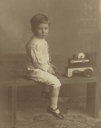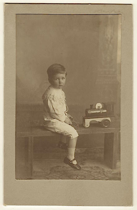 This cabinet card photograph features a young boy (?), looking forlorn, posing next to his pull toy train. The locomotive appears to made of wood. The photograph is from around the 1910’s and was found in Serbia. The photographer is unidentified. The cabinet card is in excellent condition.