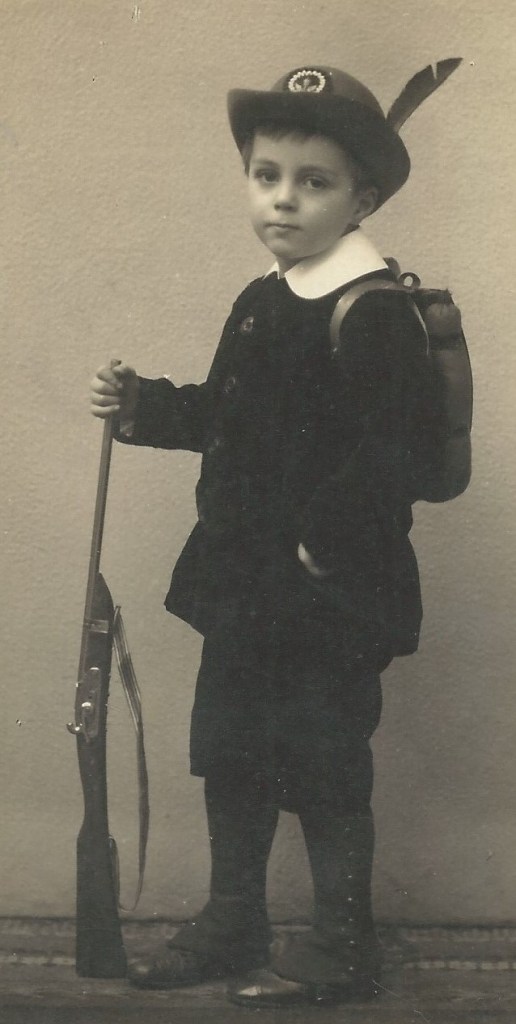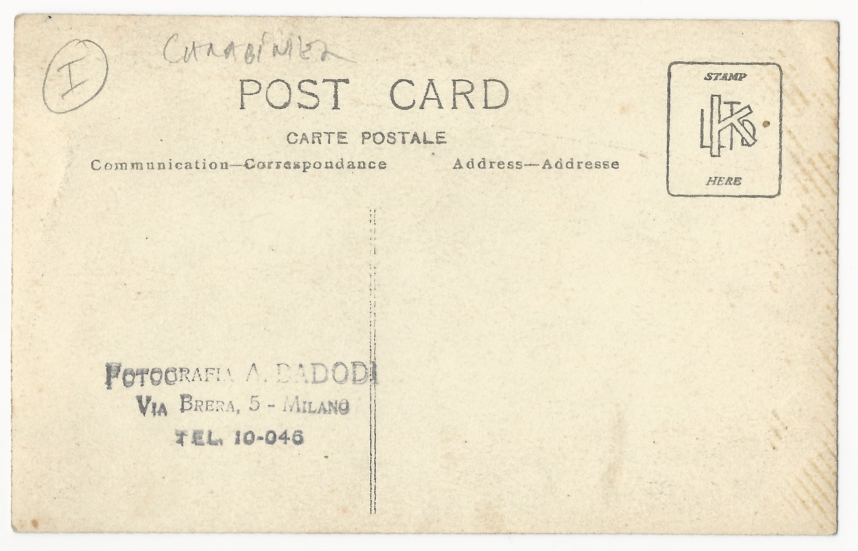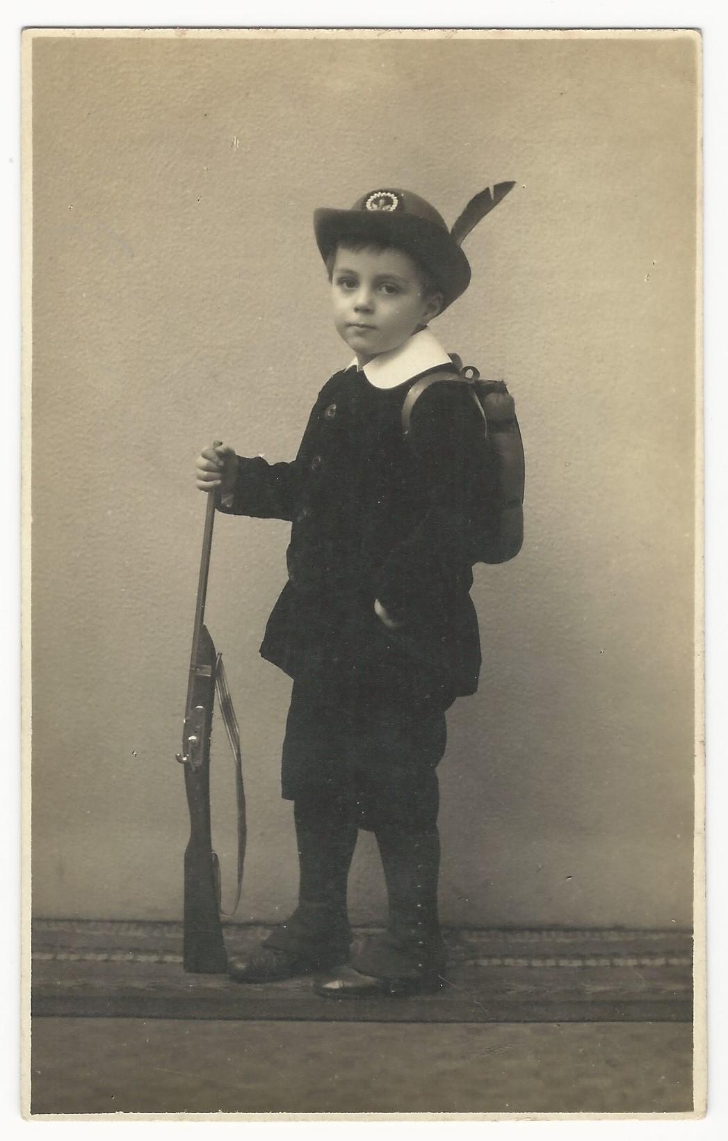 This vintage real photo postcard features a young boy wearing a backpack and holding a rifle. He is wearing a feathered hat and faces the camera with much poise. The reverse of the card has the stamp of Milan photographer Attilio Badodi (1880-1967). He was a talented and very successful photographer of European celebrities. His photos immortalized many actors and actresses. He also did portraits of Benito Mussolini. The stamp box on this postcard indicates that it was published by K Ltd. sometime between 1918 and 1936. This portrait postcard is in very good condition (see scans).