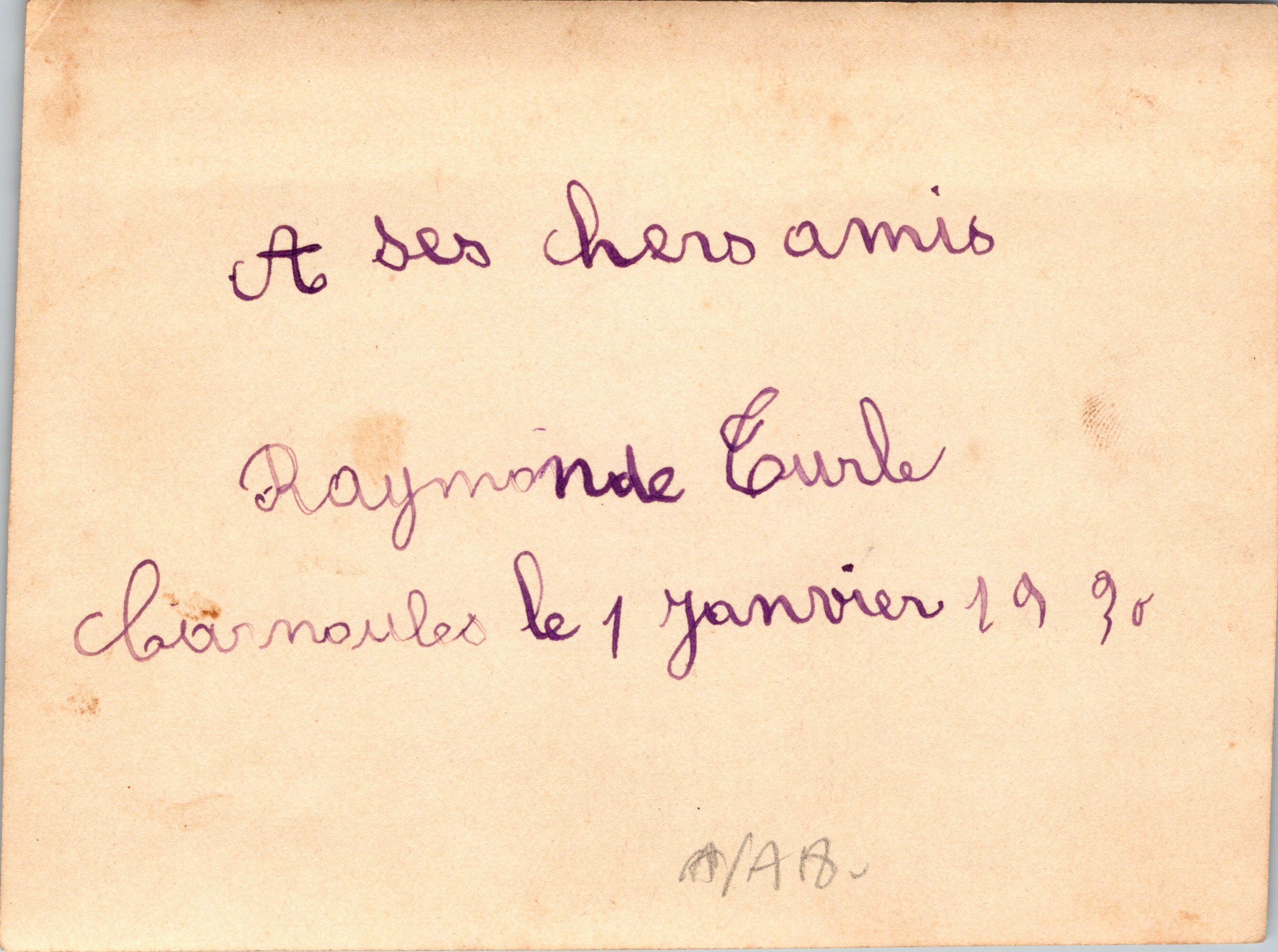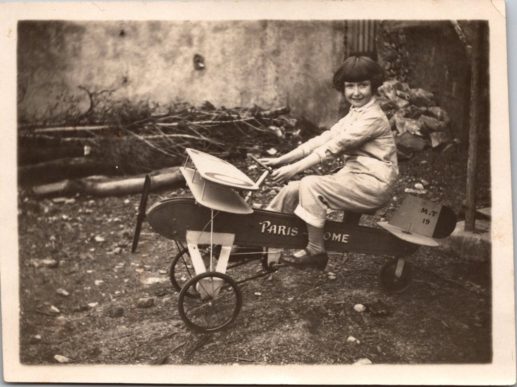 This vintage photograph features a young girl riding on a toy airplane. The plane is actually a biplane. It looks very realistic. Note the decals on the wings. There are words painted on the fuselage. My guess is that they say “Paris – Rome”. The reverse of this photograph has an inscription in French. The notation indicates that the girl’s name is Raymonde and that the photograph was taken in 1930. Since I could only partially translate the inscription, it is possible that 1930 may actually be the date that the girl was born. This vintage photo measures about 4 1/2″ x 3 1/4″ and is in very good condition (see scans).